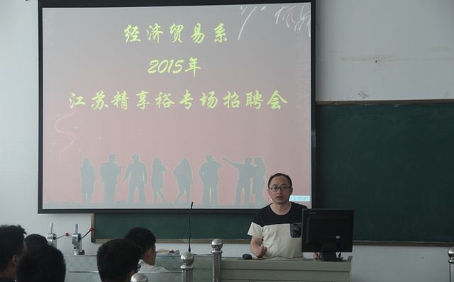 经贸系2013级学生即将离校顶岗实习,系就业领导组认真谋划,本着为学生就业服务的宗旨,诚邀江苏精享裕建工有限公司来校举办“精享裕校园专场招聘会”,招聘会于6月10日下午在经贸楼三楼会计模拟实验室进行。