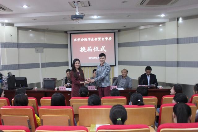 会议对医学分院“第十一届优秀学生会干部”和“第三届优秀自管委干部”进行了表彰。第十二届学生会主席和第四届自管委主席分别作表态发言,并举行了新老学生会、自管委交接章仪式。