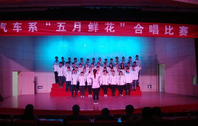 4月15日下午,汽车系在大学生活动中心举行了“五月鲜花”合唱比赛,本次比赛选曲规定每班一首指定曲目团歌《共荣啊,中国共青团》和一首自选歌曲。