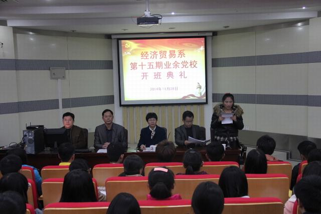 11月28日下午,经贸系第十五期业余党校开班典礼在图书馆一楼报告厅举行。经贸系党总支、学生支部全体委员及本期业余党校全体85名学员参加了开班典礼。典礼由经贸系总支副书记吴俊峰主持。