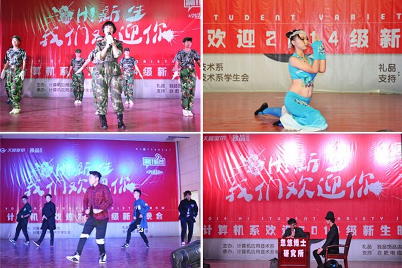 晚会前播放了大一新生辅导员老师和系领导对14级同学们殷切希望和祝福的录像,七点三十分,一曲《军中姐妹》歌舞中拉开晚会序幕,接下来,计算机系学生社团组织的节目陆续登场乐器合奏、瑜伽表演、跆拳道表演,群星模仿等节目把现场氛围一次次推向了高潮。最后,晚会在动漫社团的一曲《小苹果》表演中落下帷幕。