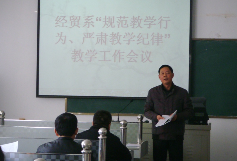 经贸系系主任宋风长同志对本学期初以来的常规教学工作进行了简要的总结,既肯定了成绩,更指出了不足,并传达了学院“关于规范教学行为和严肃教学纪律的通知”、“教学事故认定及处理办法”的主要精神,要求全系教师要根据当下学生素质现状,加强教学改革,充分利用院内外的实验实训设施,注重学生动手能力的培养,为社会输送合格的职业技术人才,并对经贸系全体教师提出三点要求:一是为人务必师表,尽职更要尽责;二是教书更要育人,努力服务学生;三是提炼自身修养,提升综合素质。