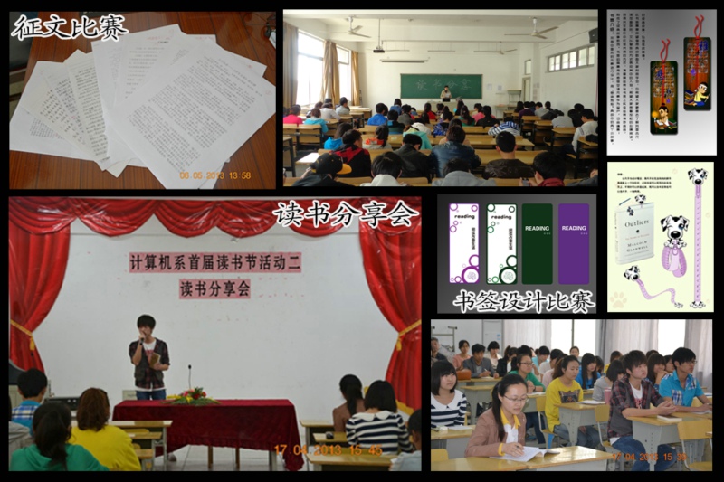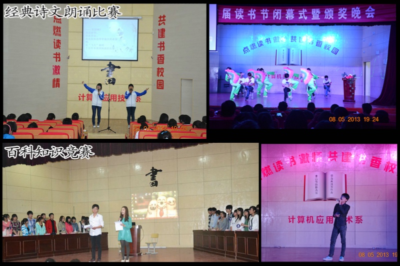 本届读书节开展了启动仪式暨读书报告会、读书分享会、读书征文比赛、经典诗文朗诵比赛、百科知识竞赛、书签设计比赛、颁奖晚会共七项活动,历时一个多月。在这一个多月中,同学们与书为友,共享读书的快乐,校园里书声朗朗,书香弥漫,活动取得了预期成效,也很有特色。具体体现在两个方面:一是活动主题鲜明,内容丰富,形式多样。七项内容活动都围绕“读书”这一主题,都通过广大同学喜闻乐见的形式表现出来。二是活动覆盖面广,开展扎实,效果明显。本届读书节覆盖全系在校17个班级每一名同学,既有全系性的启动、表彰仪式,也有班级层面的分项活动。活动开展扎实有效,在全系范围内掀起了读书热潮,取得了可喜的成果,展现了同学们的精神面貌。