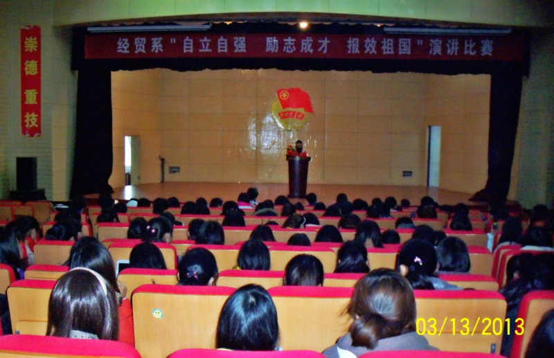 为深入开展创先争优,教育广大学生树立正确的人生观和价值观,激发大学生勤奋学习、积极进取、励志成才、报效祖国的热情,营造好学上进、和谐安定的校园环境,3月13日下午,经贸系“自立自强 励志成才 报效祖国”演讲比赛在大学生活动中心举行。此次比赛的评委由院招生就业处、院学生(保卫)处、院团委和经贸系党总支等部门负责人以及相关指导老师担任,经贸系师生近400人观看了比赛。