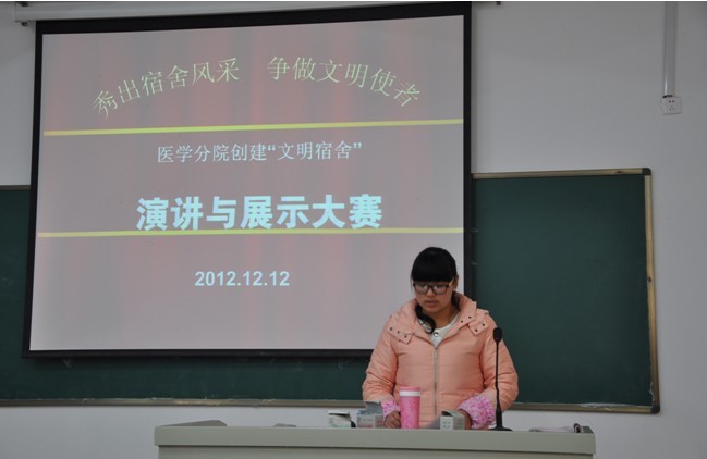 为进一步推动“文明宿舍”创建工作,弘扬积极向上的宿舍先进文化,提高学生的道德修养和沟通能力,医学分院于12月12日下午组织开展了“秀出宿舍风采 争做文明使者”主题演讲与展示大赛。