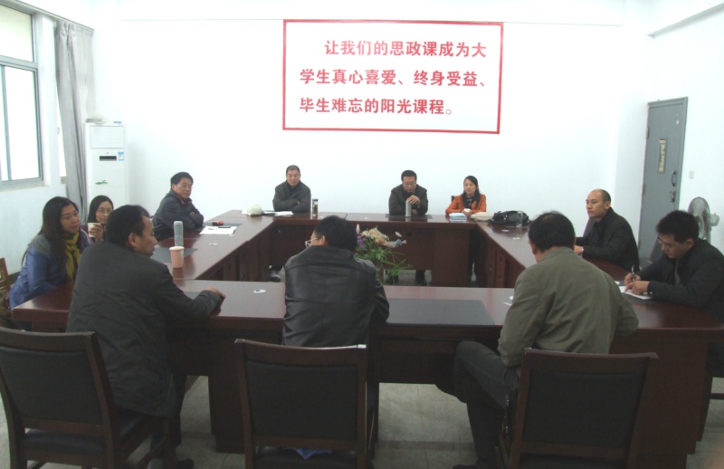 11月9日上午,池州学院思政部操国胜主任一行四人,来我院就思想政治课教学工作进行交流,与我院思政部的老师就思政课建设包括理论课开设和课时安排、实践课的教学如何开展、教师业务素质和能力提高等问题展开交流和讨论。大家一致认为,要上好思政课,教师必须不断提高自身的道德素质和理论素养,不断研究教材、研究学生、研究社会,力争把理论和实际结合起来。