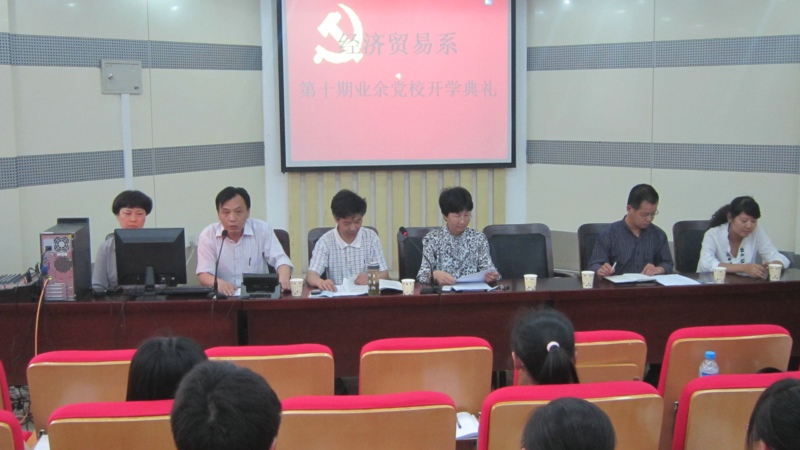 5月9日下午,经贸系第十期业余党校开班典礼在图书馆一楼学术报告厅举行。经贸系党总支及学生党支部成员、学生干部代表、本期业余党校全体学员等共80余人参加了开班典礼。开班典礼由经贸系副主任宁业群主持。学生(保卫)处处长祝建平出席开学典礼并为培训班上了第一堂党课。