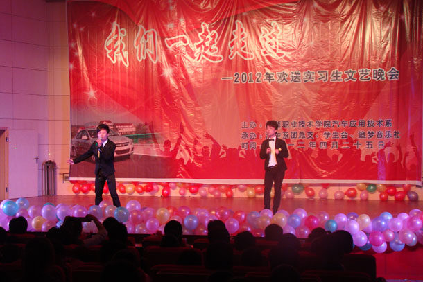 4月25日晚,由汽车系主办,汽车系团总支、学生会、追梦音乐社承办的2012年“我们一起走过”欢送实习生文艺晚会在院大学生活动中心隆重举行。汽车系主要负责同志和近500名10级毕业实习班级学生观看了整台晚会,来校招聘的南京万通汽修学校的领导老师也应邀观看了晚会。