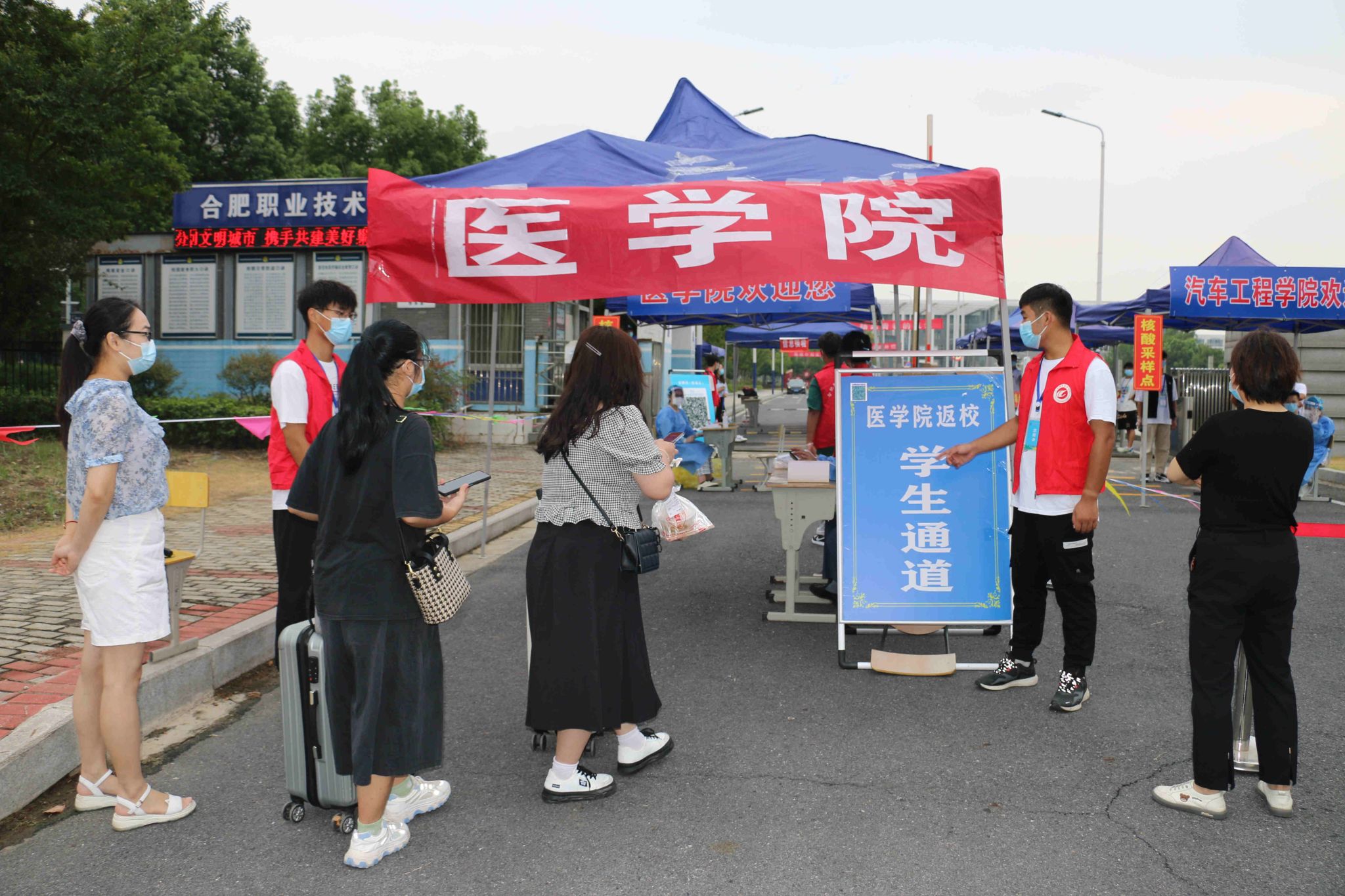返校时,学生佩戴口罩,持学生证保持间距排队进入校园,依次进行核酸检测、测温、查验健康码、行程码、48小时核酸检测结果、行李消毒、换口罩等环节后,方可进入校园。现场井然有序,学管和学生志愿者们紧密配合。