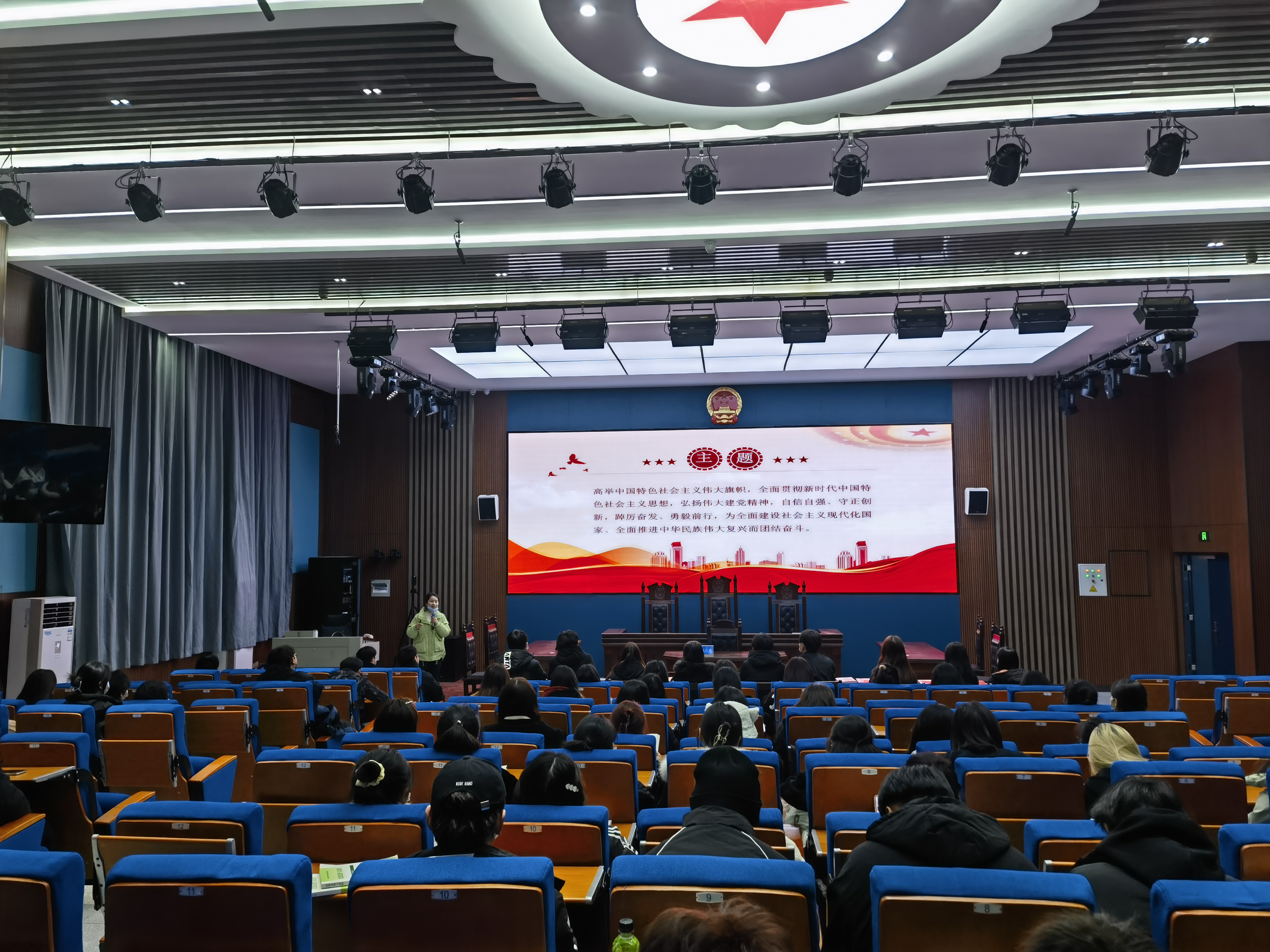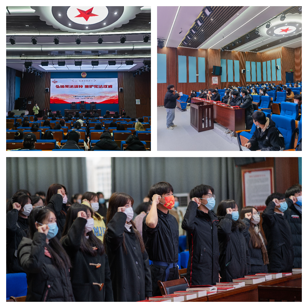 为深入学习贯彻党的二十大精神,全面贯彻落实习近平法治思想,在大学生当中弘扬宪法精神,维护宪法权威,11月30日下午AC米兰官网天平法学会在思政馆模拟法庭开展了以“弘扬宪法精神 维护宪法权威”为主题的教育活动,马克思主义学院院长靳玉琼、部分思政课教师和全体法学会会员参加了此次活动,活动由学会指导老师丁丹丹主持。