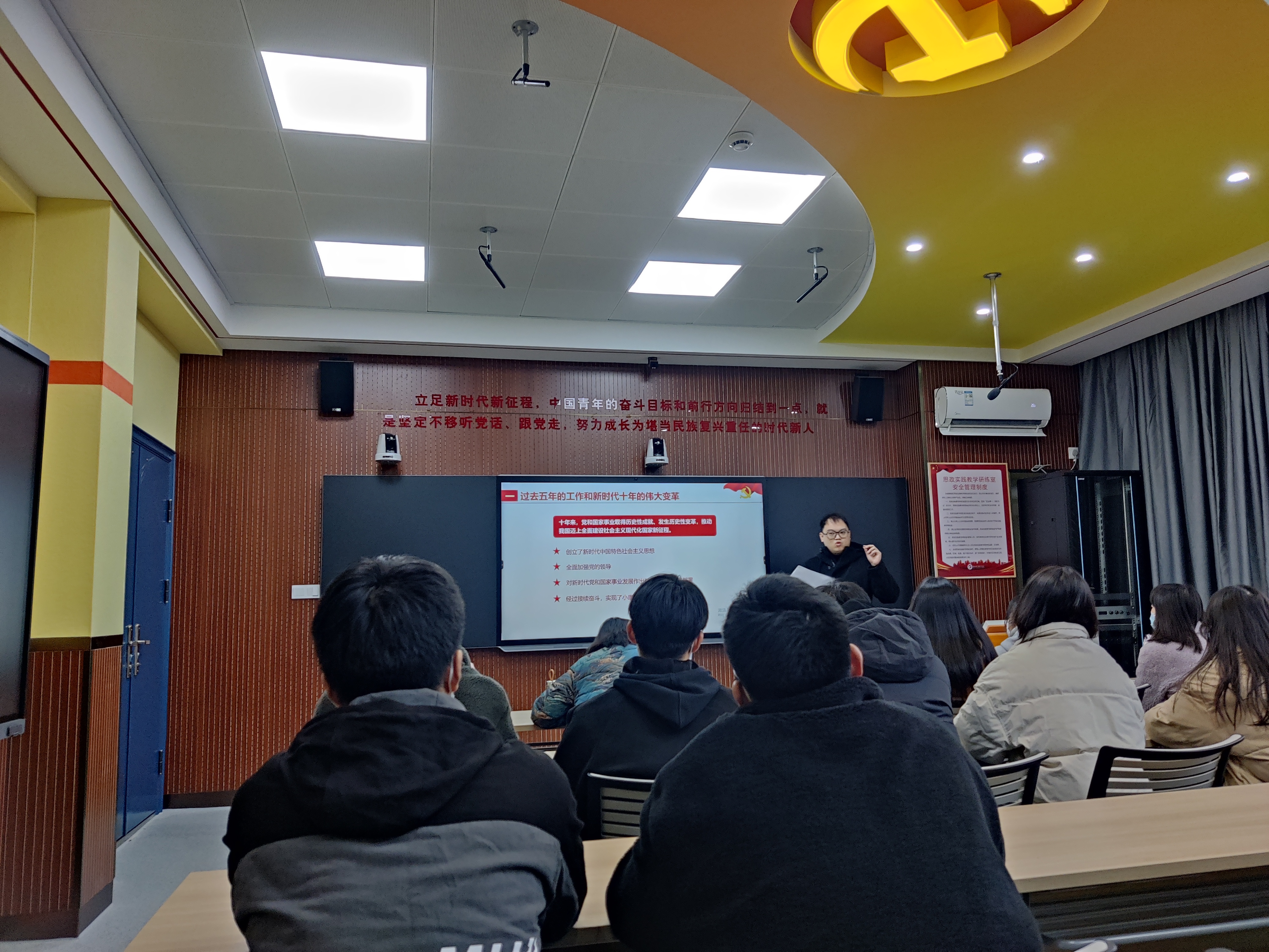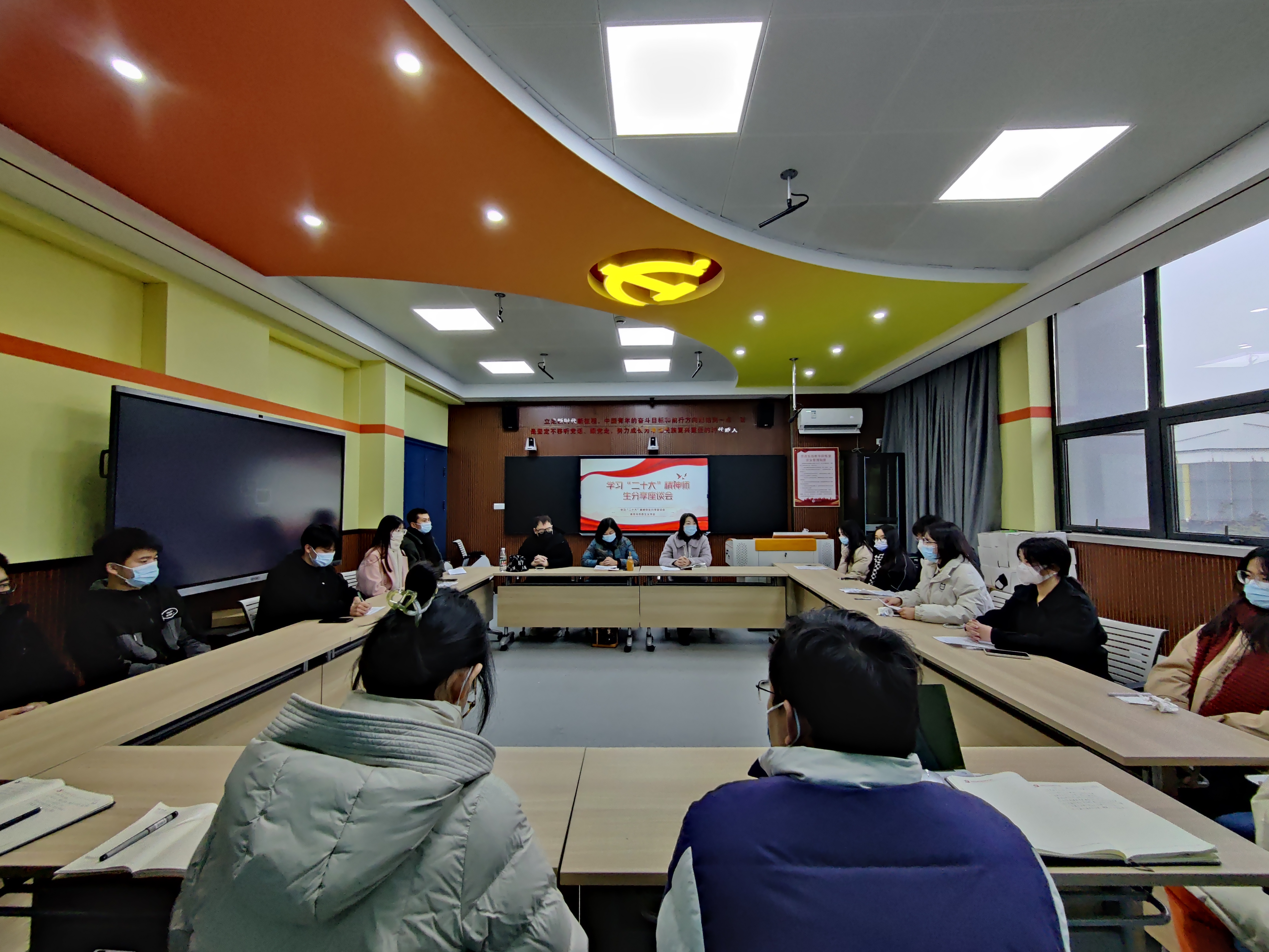 座谈会上,吴昊老师结合师生生活实际,立足党的十八大以来我国经济社会所取得突出发展成果,给全体师生做了题为“新时代十年的伟大成就和伟大变革”的主题宣讲,宣讲主题鲜明、内容丰富,现场热情高涨、气氛活跃。随后,全体师生立足自身学习实际,紧扣宣讲主题,围绕马克思主义中国化时代化最新理论成果、党的百年征程、新时代青年学生的使命担当等等方面,做了交流分享。与会老师对学生的精彩分享交流做了点评,并就青年学生如何更好的学习宣传党的二十大精神做了指导。