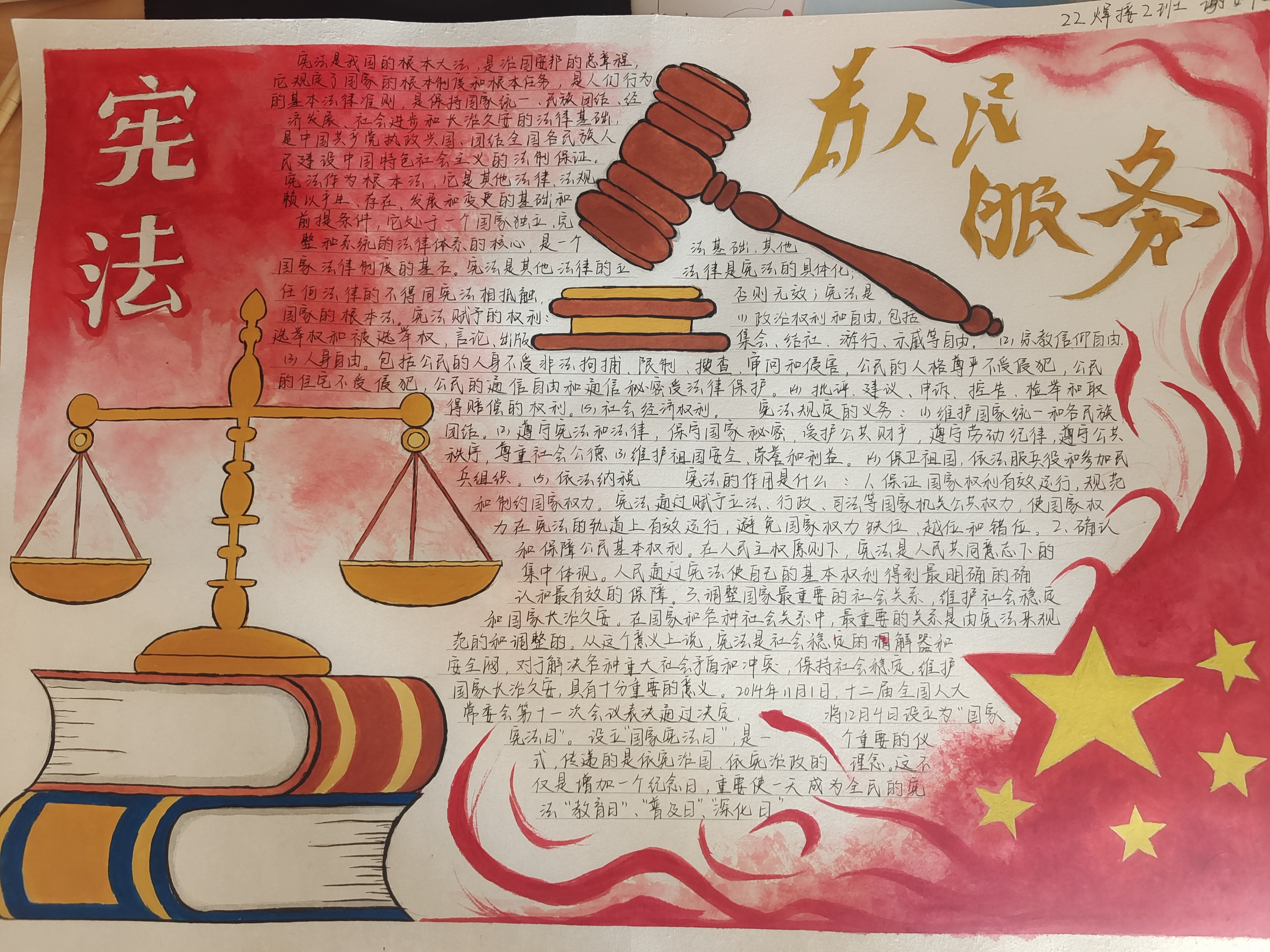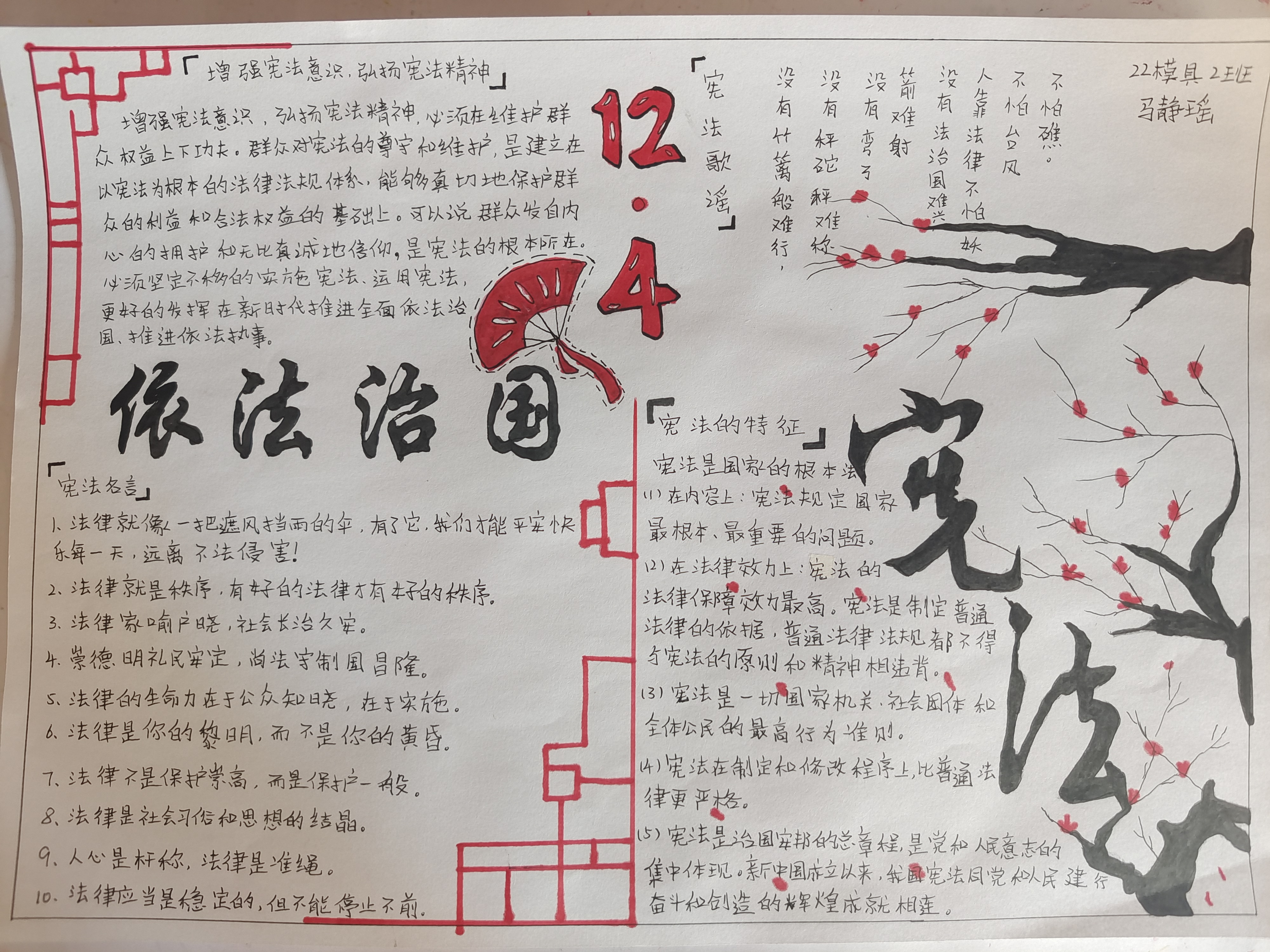 “学宪法”手抄报绘画活动。伴随着线下宪法知识竞答活动的举行,学院同步开展了“学宪法”手抄报绘画活动。活动采用线下收集、线上投票的方式,进一步营造了学院良好的法治教育氛围。通过一幅幅精美的手抄报,同学们用绘画的形式对宪法知识,特点,性质,地位等方面进行展示。