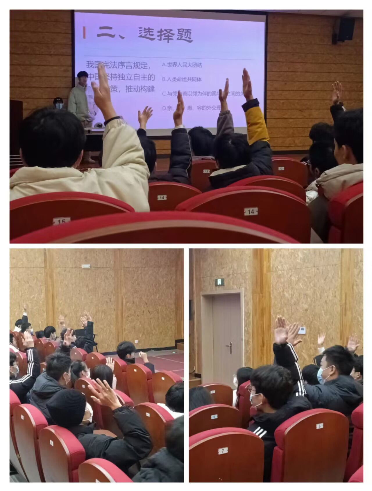 “知宪法”知识竞答活动。活动开始,随着同学们的陆续到来,主持人宣读比赛规则采用积分制,最后得分高者获胜。了解竞答规则后,选手们认真听题,在主持人“3,2,1”抢答指令下达后,眼疾手快,迅速抢答。在答题的过程中同学们拓宽了知识面,重温宪法历史进程,思维的碰撞燃起知识的火花,在宪法知识竞赛中感受到了依法治国、执政为民的魅力,丰富文化生活最终22焊接2班包兴兴同学赢得了比赛第一名,冯向阳位居第二。通过加题赛程奥运同学获得了第三名。