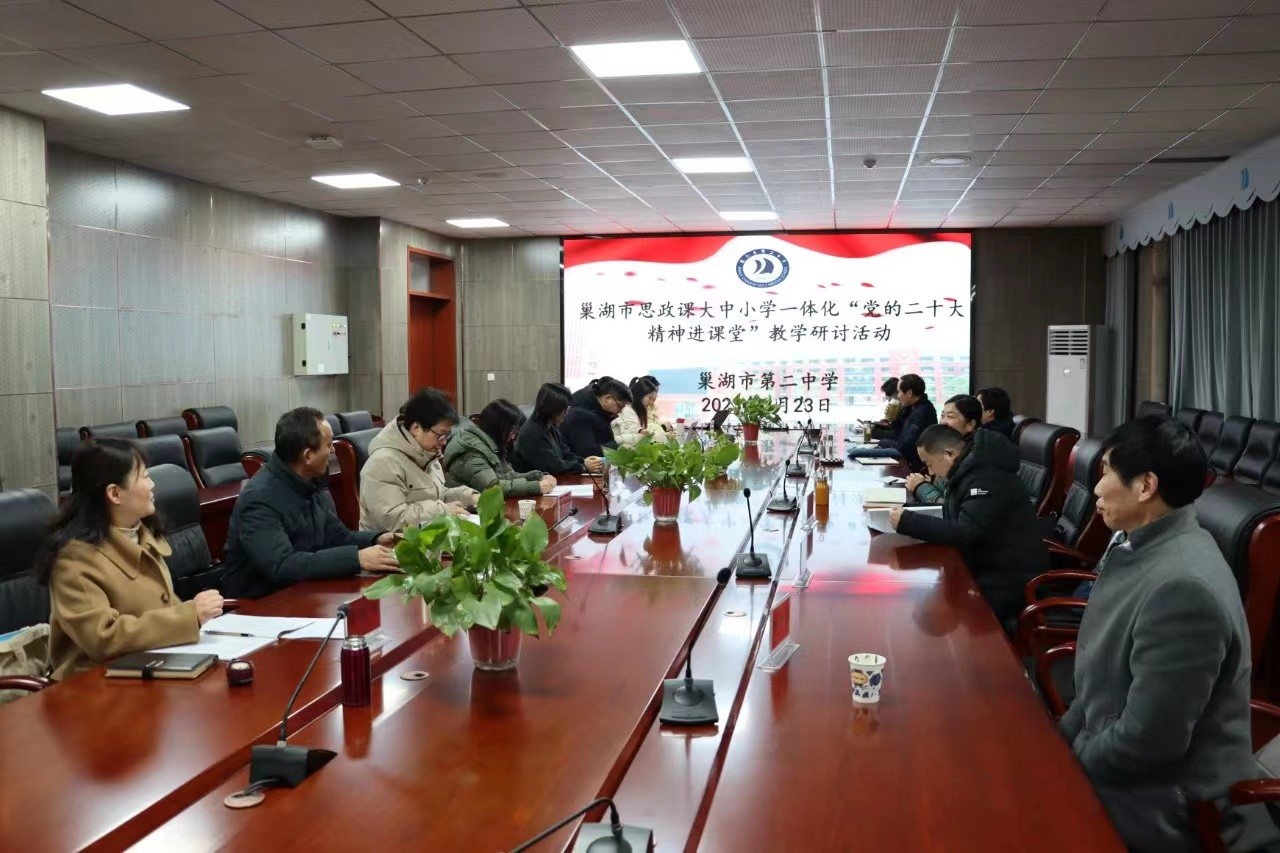 为深入学习贯彻党的二十大精神,将党的二十大精神融入大中小学思政课,进一步加强大中小学思政课一体化建设,提升大中小学思政课一体化教学水平,2月23日,巢湖市教体局组织召开巢湖市大中小学思政课一体化“党的二十大精神进课堂”教学研讨活动,巢湖市小学、初中、高中、大学各个学段的思政课教师代表二十余人参加了此次活动,AC米兰官网马克思主义学院院长靳玉琼一行应邀参加。