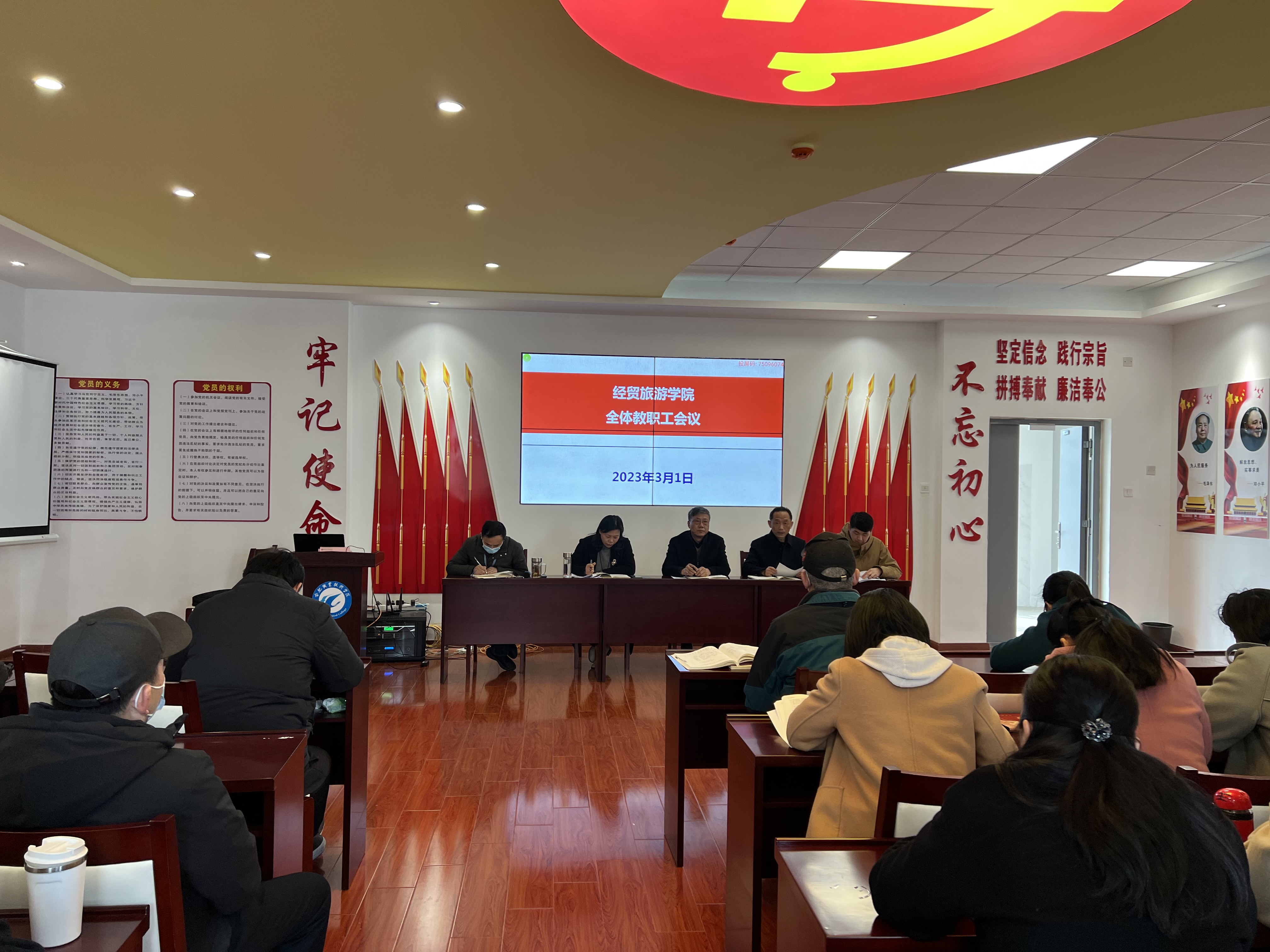 3月1日下午,经贸旅游学院在党性体验馆召开全体教职工大会暨政治理论学习会议。学院党政、全体教职工参加会议,会议由副院长陈继林主持。