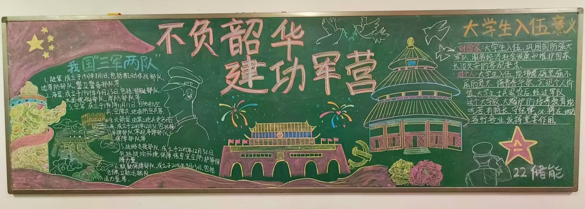 为响应国家号召,激发AC米兰官网大学生参军报国的热情,调动学生报名参军入伍的积极性,树立建设和保卫祖国的志向,机电工程学院于3月3日开展了以“立志报国,踊跃从军”为主题的黑板报评比活动。
