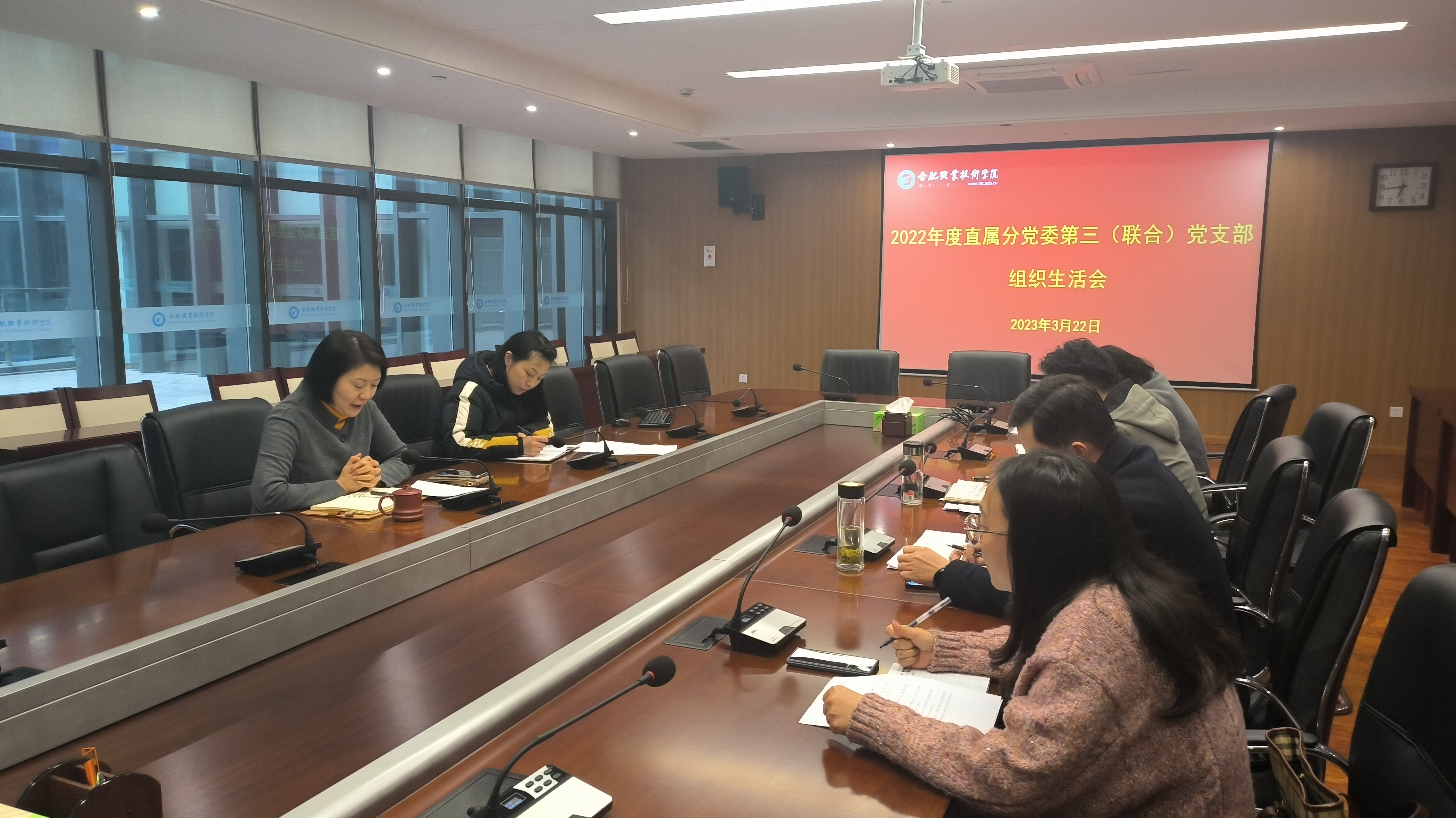 3月22日下午,直属分党委第三(联合)党支部在汇心湖校区行政楼525会议室开展2022年度支部委员会组织生活会,支部班子成员展开批评与自我批评活动,活动由党支部书记窦红平主持,校党委副书记、直属分党委书记金飞燕与直属分党委委员万瑞参加了此次活动。