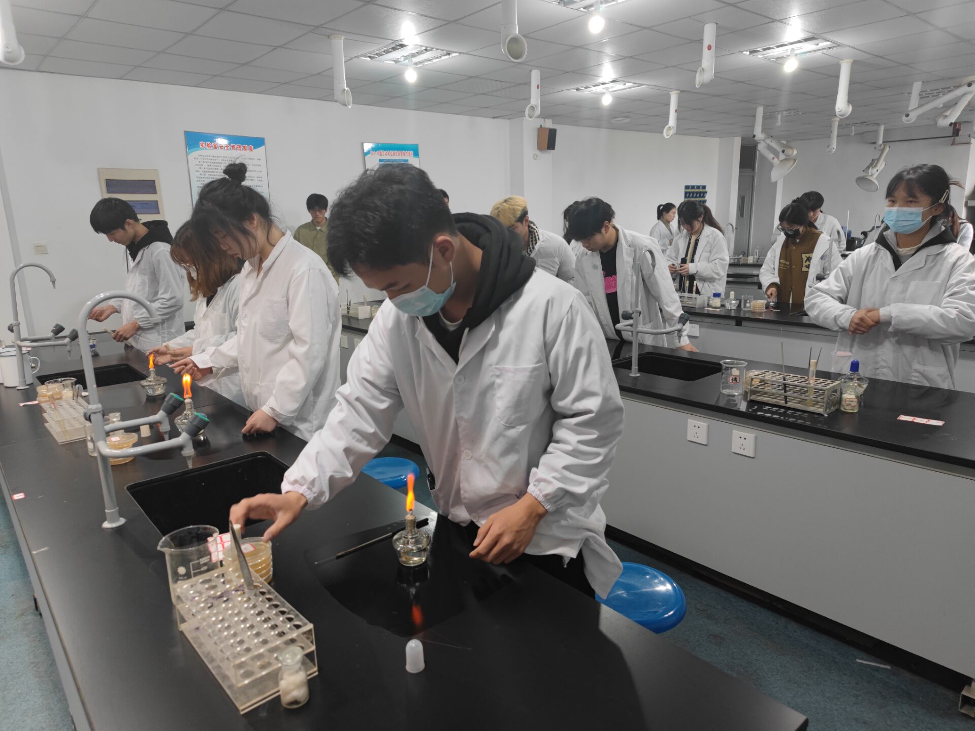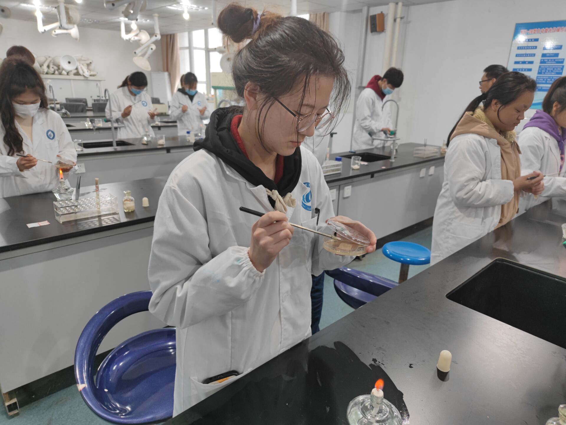 随着裁判开始指令发出,92名参赛选手按照分批次进入座位。无论是接种取菌、平板划线还是培养基培养,选手们都沉着应战、规范操作。在长达3小时的比赛中,选手们都圆满完成各项指定任务,展示了良好的业务技能和高素质的职业风采,裁判组也严格按照评分标准,对每位同学参赛作品进行准确评分。
