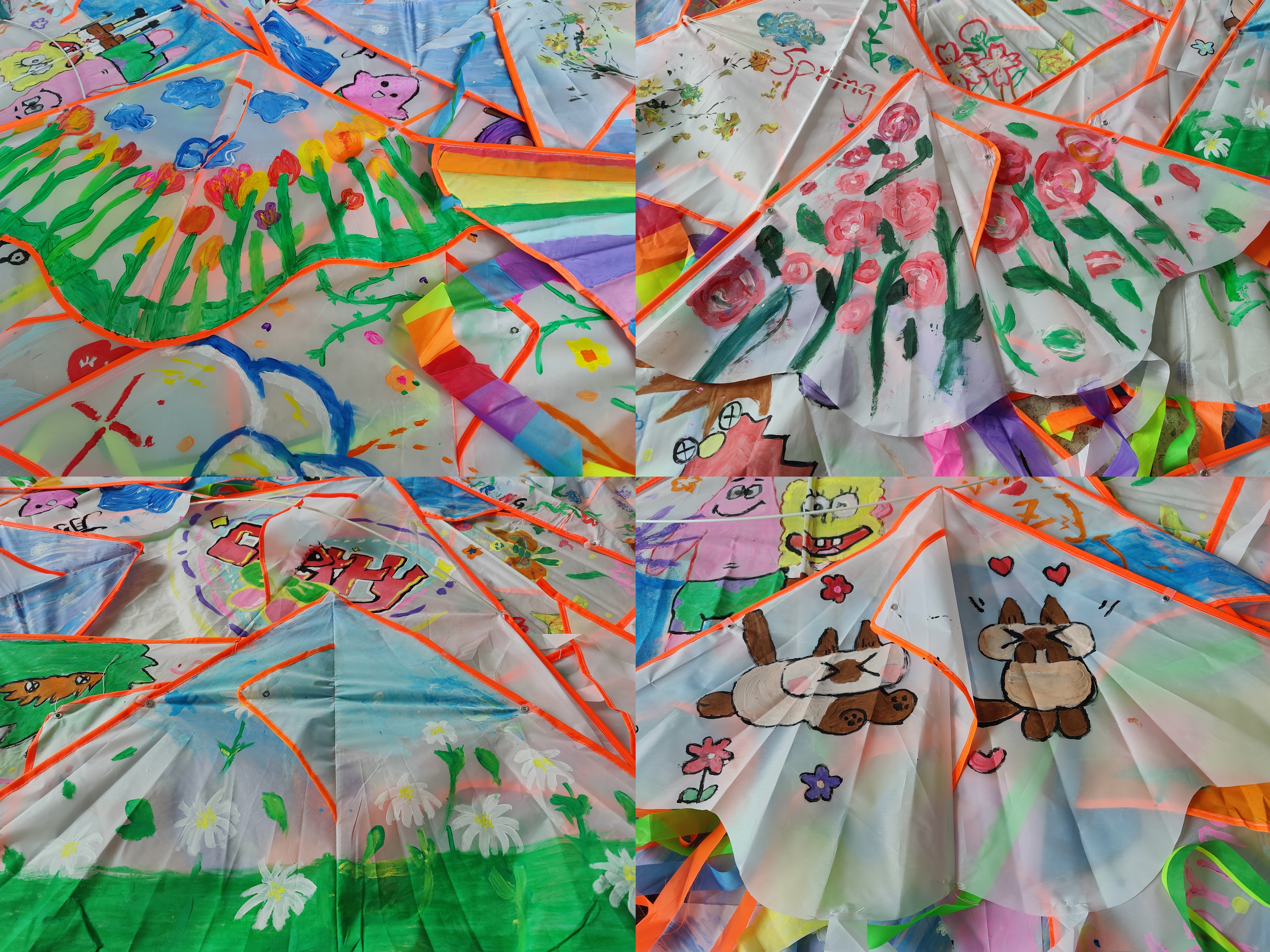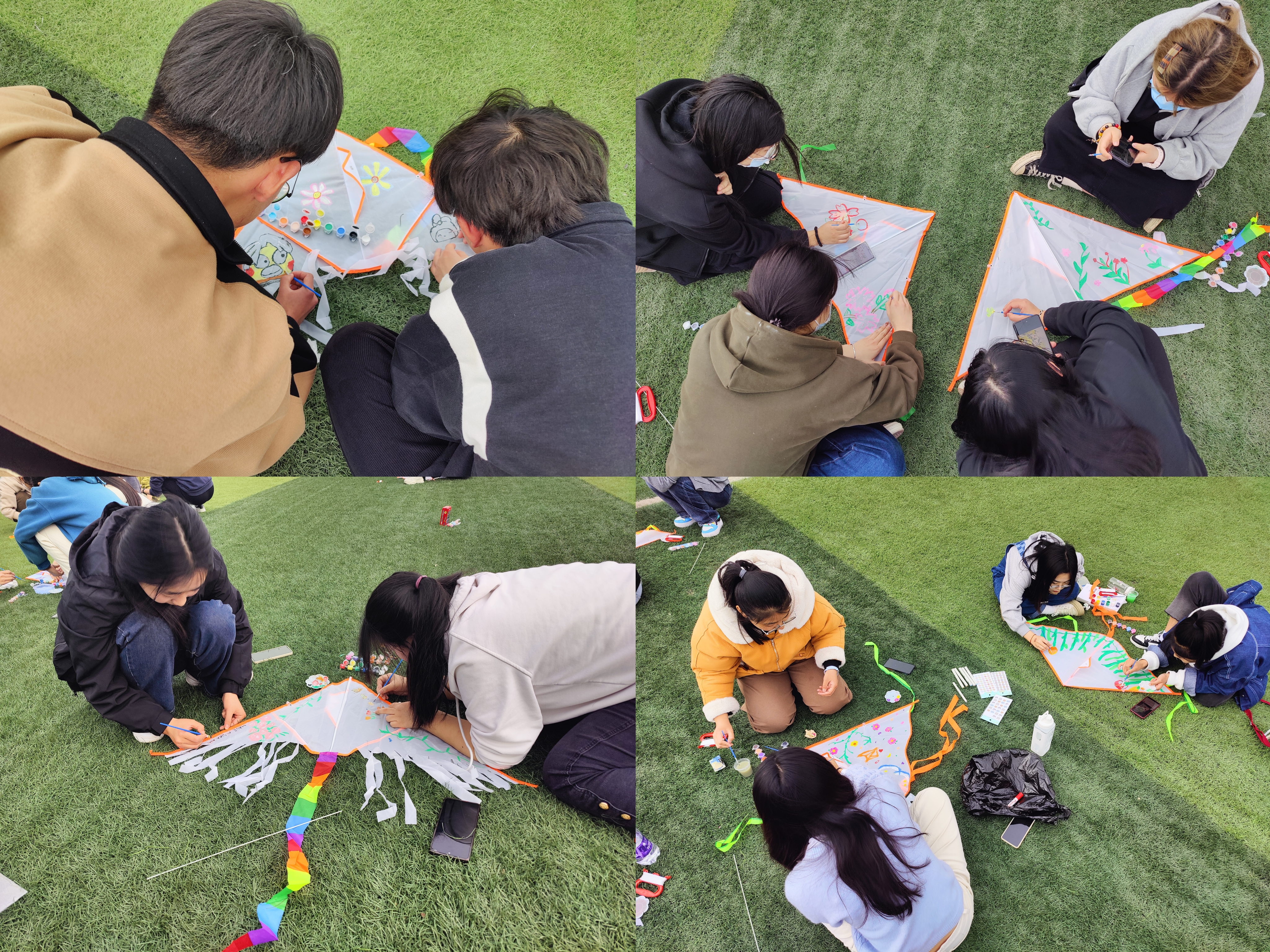 本次活动有两种参与方式,两人组队和以宿舍为单位的四人组队。活动现场,学院志愿者提前准备好活动的材料,参加的同学有序领取风筝后纷纷在足球场上席地而坐,齐心协力开始在风筝上以“花young世界,与你分享我的春天”主题进行绘画。一朵朵五颜六色的花,在操场上绽放,大家脸上也荡漾着笑容。