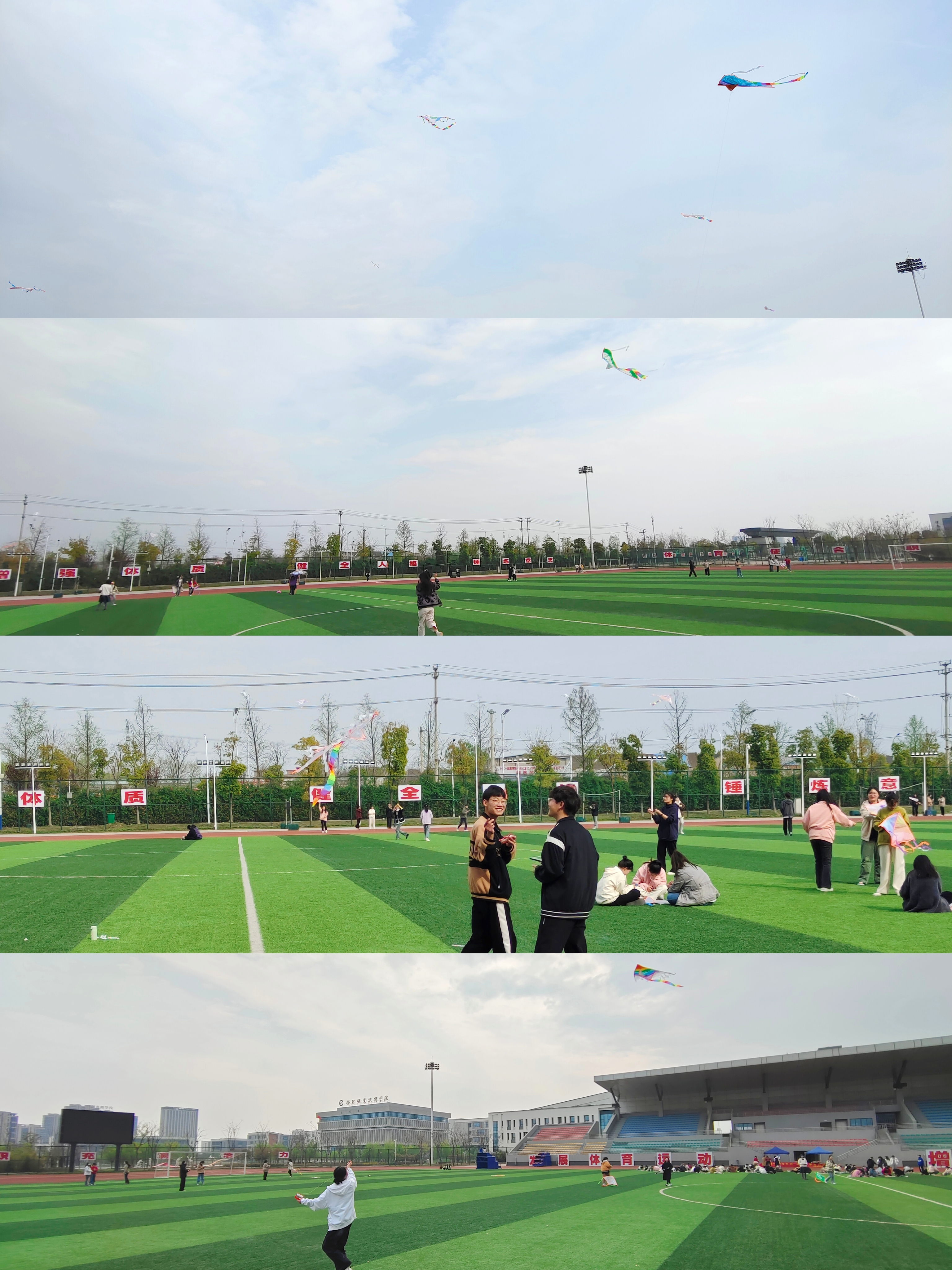 风筝创作结束后,大家兴奋不已地拿着风筝开始在操场试飞,烦恼在风筝升起的那一瞬间仿佛就烟消云散,欢乐的笑声伴随着五彩的风筝在风中飞翔,同学们开心地在操场上奔跑着。