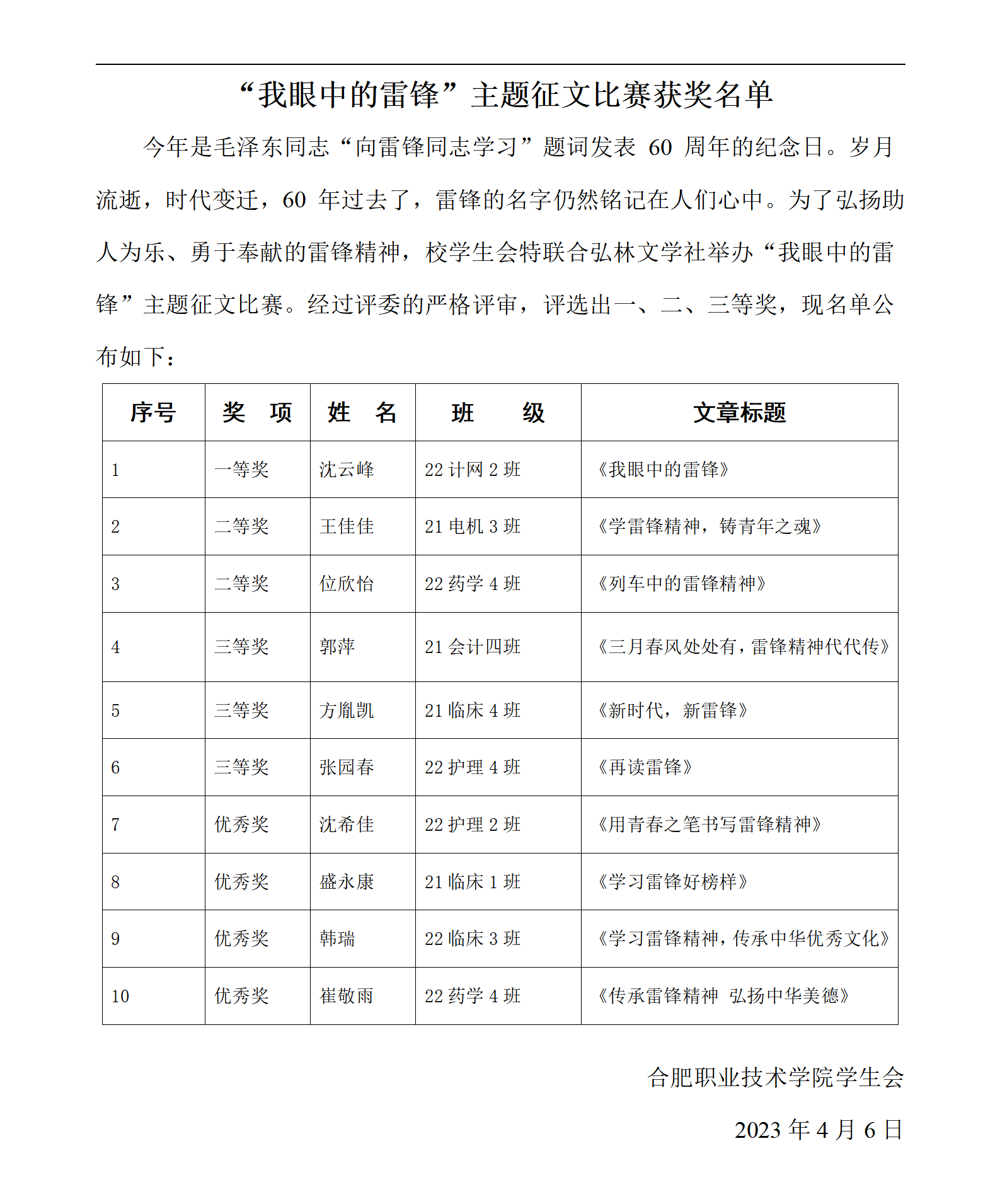 千帆竞渡,百舸争流。为深入学习宣传贯彻党的二十大精神,进一步弘扬雷锋精神,帮助学生深刻理解雷锋精神的内涵实质,推动学雷锋活动常态化长效化,校学生会、弘林文学社于3月1日—4月1日联合主办“我眼中的雷锋”主题征文比赛。