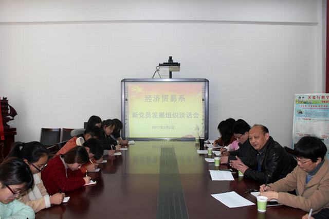 按照党员发展程序,3月2日下午,经贸系在系二楼会议室召开新党员发展组织谈话会,副院长周晓隆和新吸收的预备党员们进行了一场亦师亦友的谈话,对预备党员们提出了希望和要求。经贸系学生支部全体教师党员及赵璇等12名在校预备党员参加了会议。会议由系党总支书记王秀珍主持。