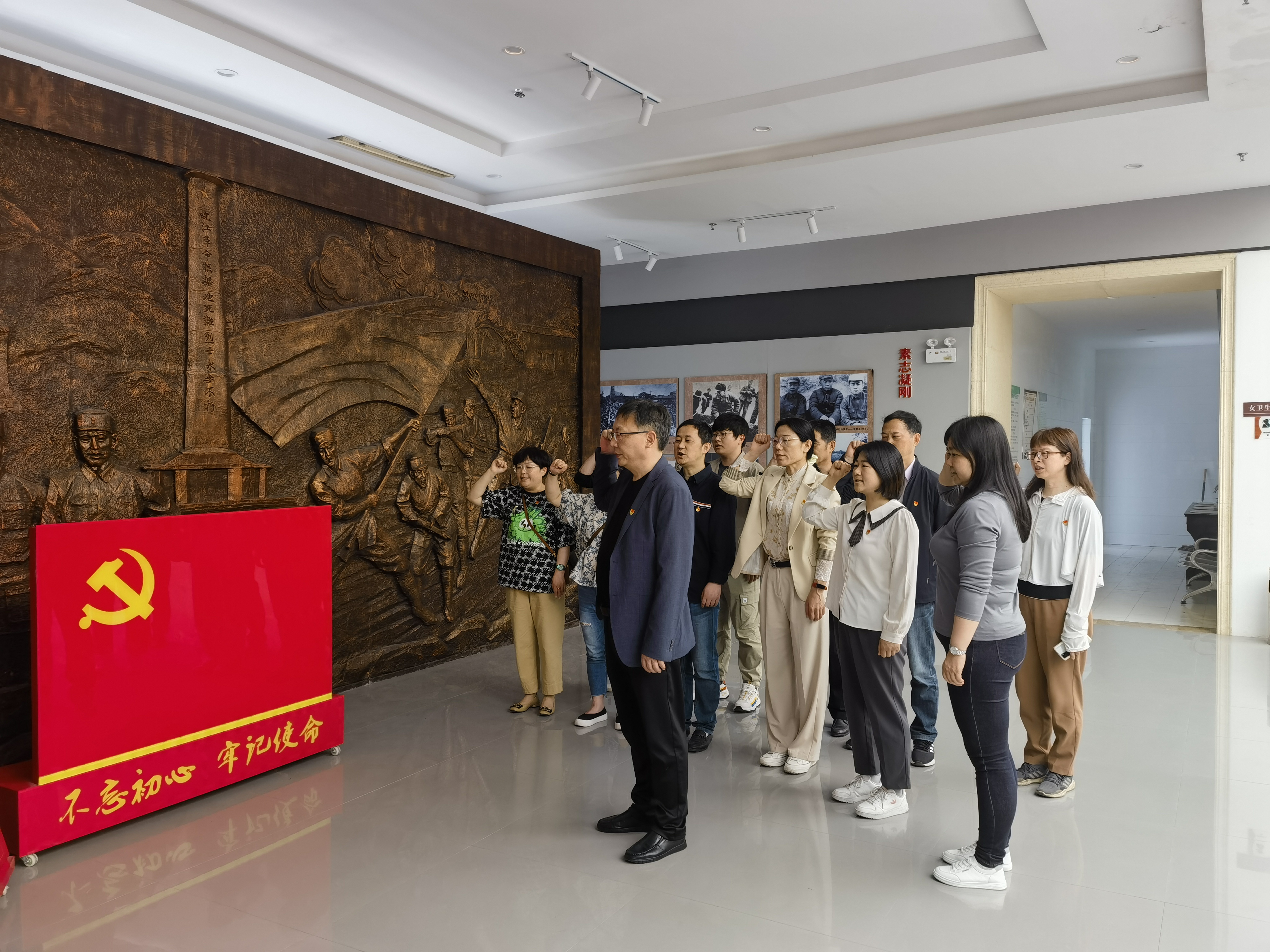 全体党员跟随讲解员参观了新四军第七师纪念馆八个展厅,瞻仰革命先烈们的红色遗物和战争照片,回顾革命先辈们艰苦曲折的战斗历程,充分感受老一辈革命家朴素坚贞、严守自律的“红色基因”。在展厅的渡江战役纪念浮雕旁,全体党员在党支部书记沈曙东的带领下,高举右手,面向党旗,庄严宣誓,一句句铮铮誓言,是担当、是责任,是心之所向、是行之所往。