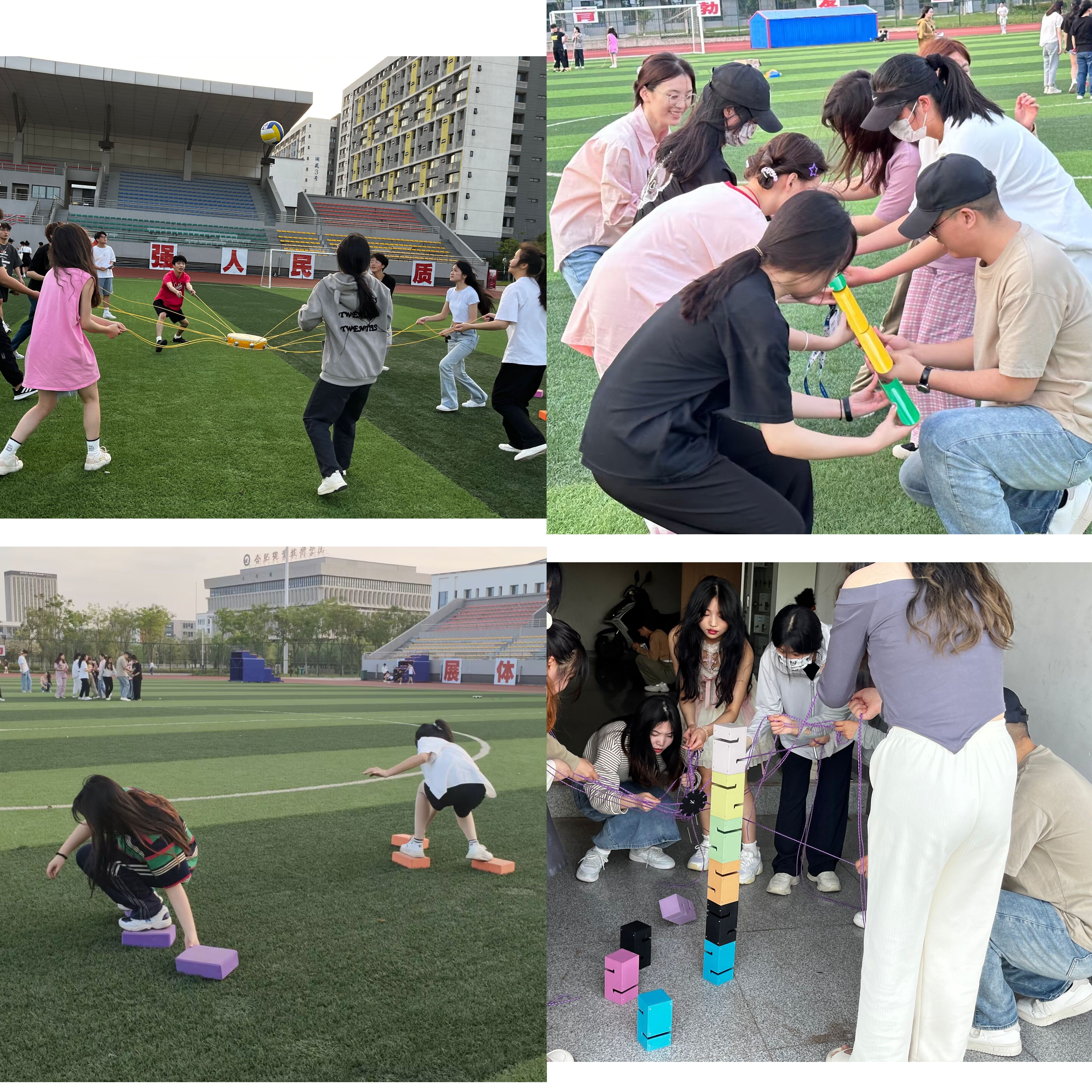运动会现场气氛热烈,各班级参赛队员尽情释放着活力。在“珠行万里”和“轨道运球”中,同学们集中注意力,相互协商合作,不停试错,相互加油打气,最终达到目的地;在“巨人脚步”中,队员们相互配合,共同前进,在一声声整齐响亮的口号声中冲向终点;在“击鼓颠球”与“合力建塔”计时赛”中,同学们也在激烈的竞争中展现着团结协作的精神;在“趣味拔河”中,各参赛队伍通过队员之间的默契配合相互比拼淘汰对手;在“摸石过河”项目中,各参赛队员们小心谨慎又健步如飞……各个项目的趣味性让现场气氛热烈,同学们欢声笑语。