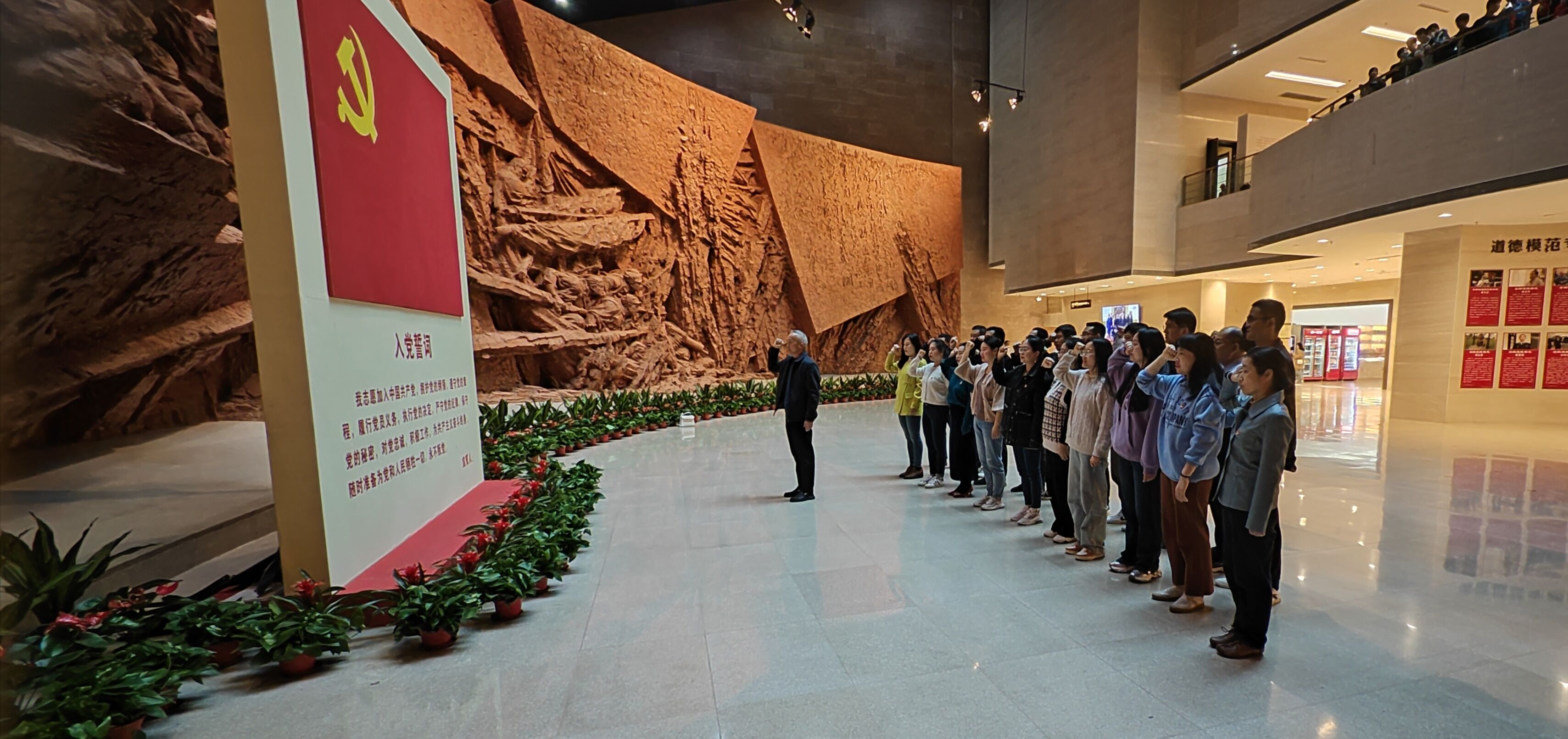 进入纪念馆后,全体党员在鲜红的党旗前举行了重温入党誓词活动。在汪春荣的带领下,面对鲜红的入党誓词,全体党员举起右手,庄严宣誓,重温入党誓词,在铿锵有力的宣誓声中表达了党员们为共产主义事业奋斗终身的决心和信念。随后参观了渡江战役纪念馆,馆内展厅以“百万雄师过大江”为主线,分为“战前形势”“战役准备”“突破江防”“战役胜利”“人民支前”“英烈业绩”等六部分。在馆内讲解员的讲解下,党员们全面地了解了渡江战役的光辉历程。通过2500余件历史照片、文物、油画、雕塑等影像和文物资料,生动地再现了70多年前人民解放军横渡长江的战斗历程,让党员们身临其境般感受到当年革命先烈不怕牺牲、英勇斗争的革命激情,感受伟大的渡江战役精神,感悟爱国情怀。