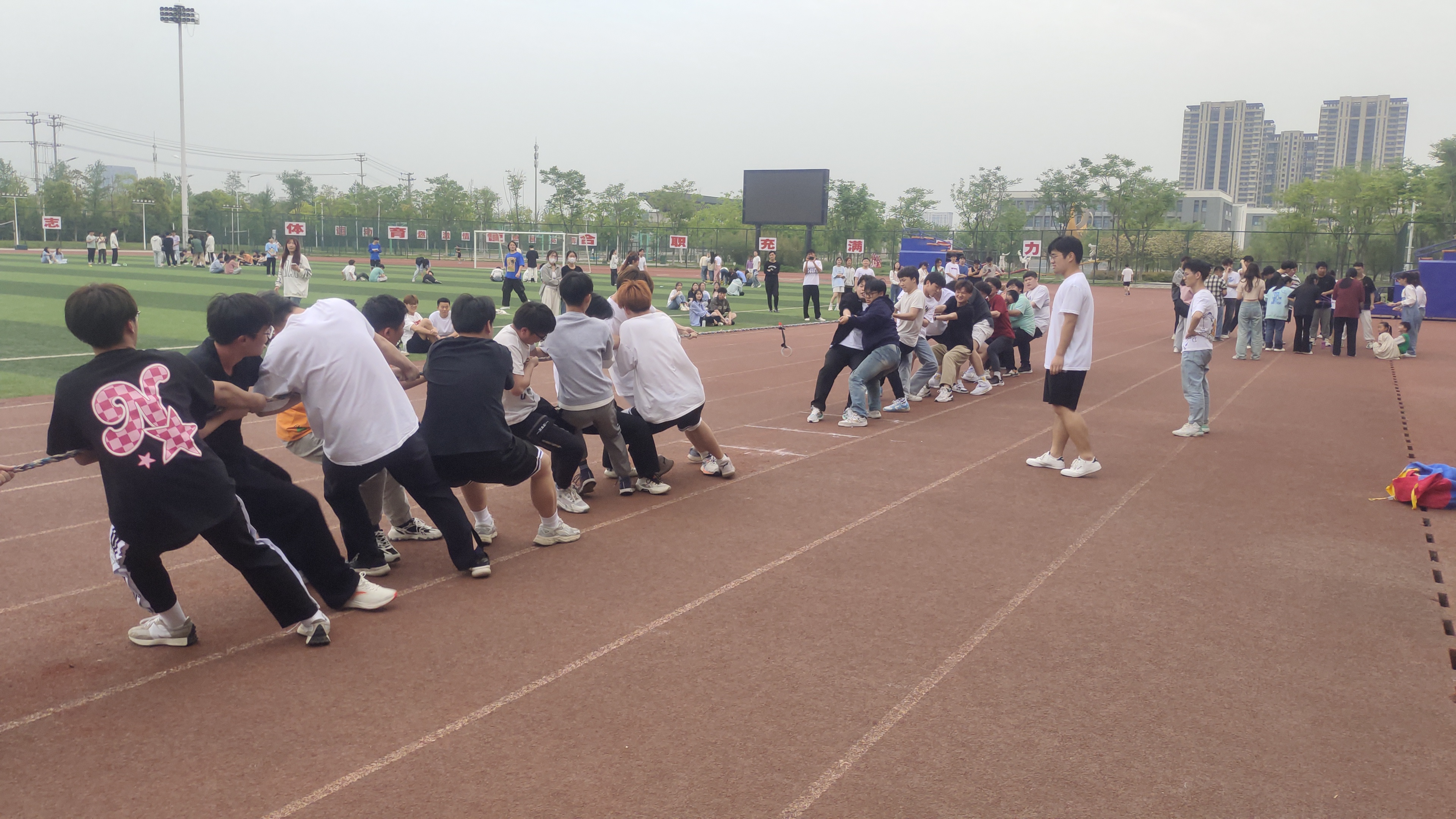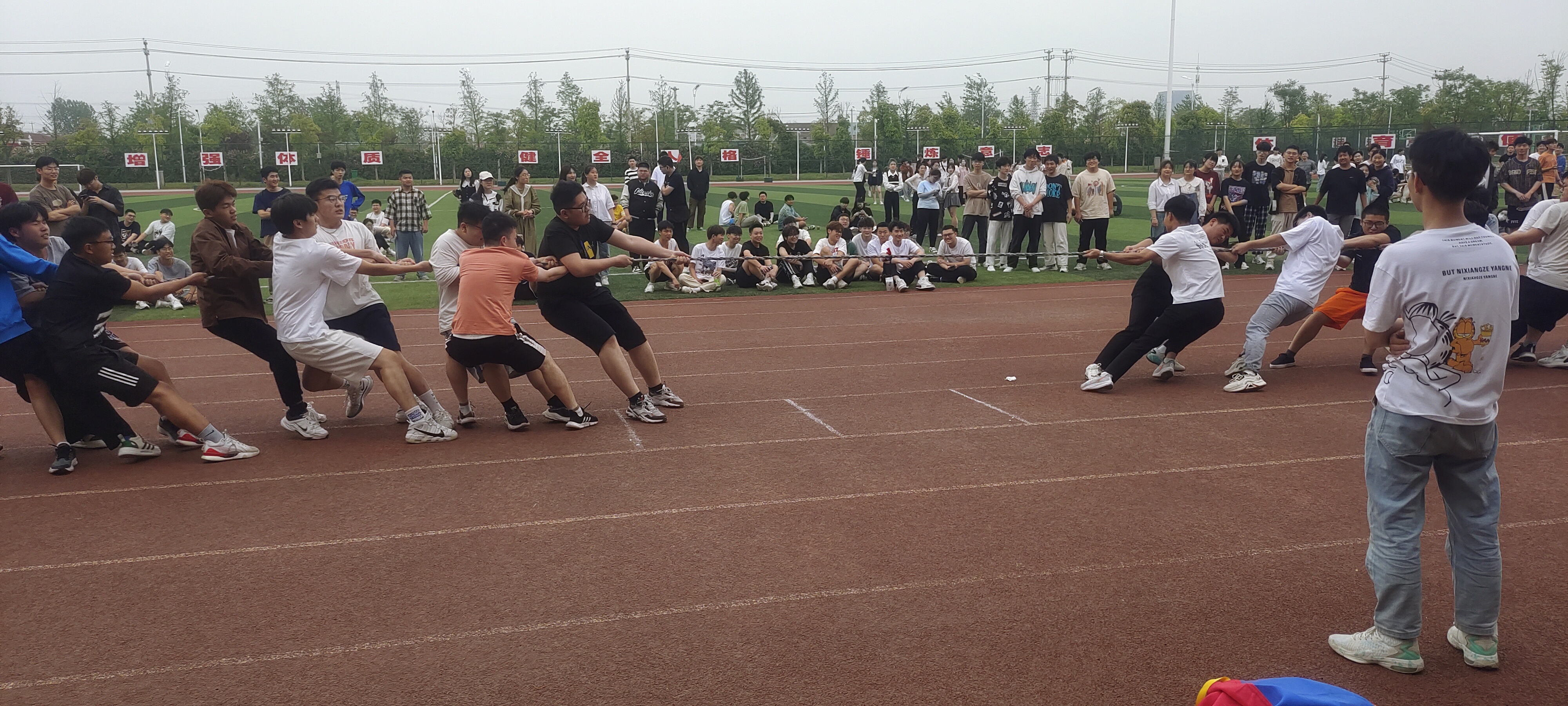 本次趣味运动会共设“趣味拔河”“鼓动人心”“摸石过河”“无敌风火轮”四个比赛项目。本着“趣味交流第一,比赛竞技第二”的原则,在比赛场上,学生们笑容满面,奋力拼搏,展现出朝气莲勃的精神面貌。经过一场场比赛角逐,最终,22机电1班、2班,22焊接1班获得最佳团体奖。