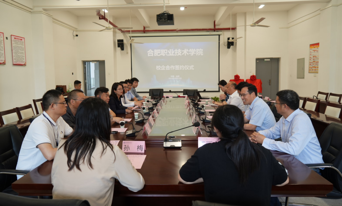 周晓隆首先代表学校对企业一行的到来表示热烈的欢迎,随后肥东国轩新材料有限公司总监王娟、通威太阳能(安徽)有限公司人力总监谢文武、安徽布尔自动化工程有限公司校企合作主管陈善金分别针对此次校企合作进行交流发言。