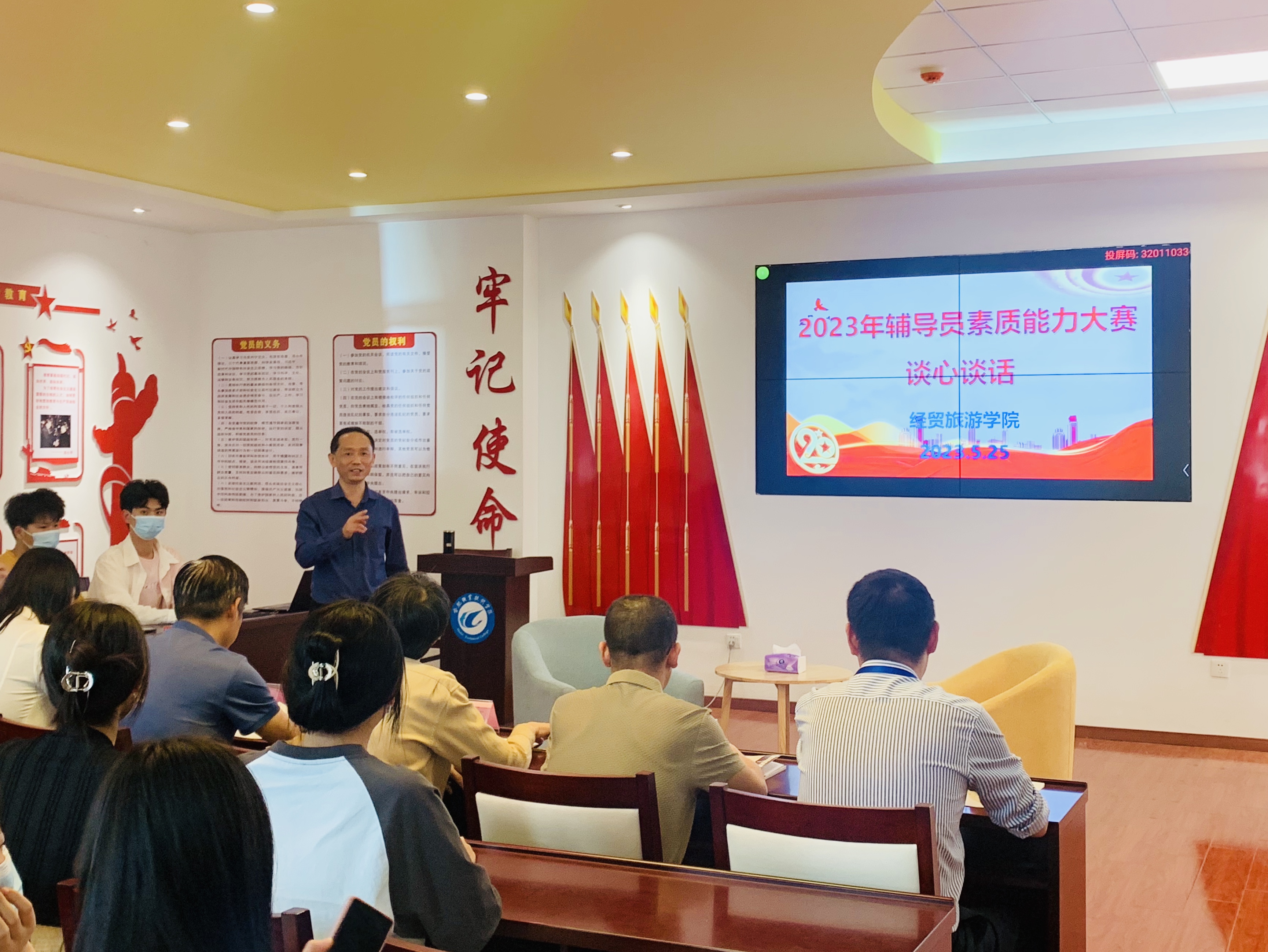 5月25日下午,经贸旅游学院在学院党性体验馆举办2023年辅导员素质能力大赛决赛。校工会主席王秀珍、学院院长赵红、校学生处副处长王文俊、机电工程学院党总支副书记丁迎春、信息传媒与工程学院党总支副书记刘泽发担任本次大赛评委。全体专职辅导员、学生代表现场观摩了比赛。
