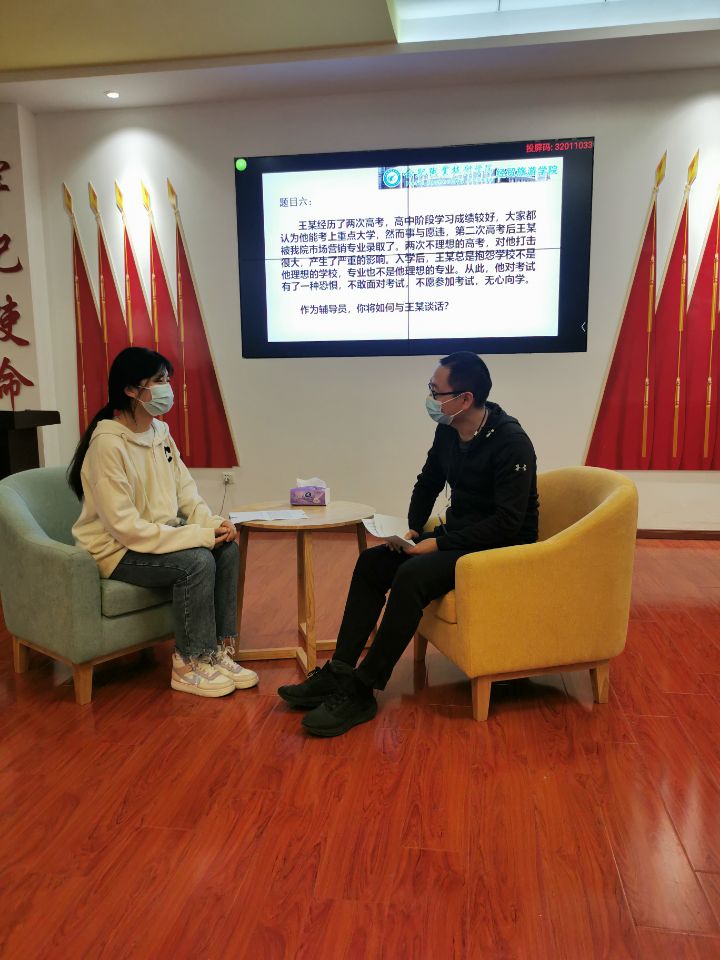 本次大赛由学院学管办组织实施,共有9名专职辅导员参赛,前期在开展理论知识测试笔试的工作基础之上,决赛主要考察辅导员“谈心谈话”这一环节的业务能力素养。“谈心谈话”主要考察辅导员对相关理论政策、学生特征、学生成长成才规律的了解及对问题的解决能力和教育引导能力。本次大赛的赛题紧密结合学院学生实际,涵盖学生日常容易出现的问题:学生入党、学生资助、学习适应、宿舍生活、课堂教学、心理问题等。参赛选手在比赛中充分发挥出自身出色的业务能力和职业素养,帮助学生解决实际困难,达到了良好的效果。