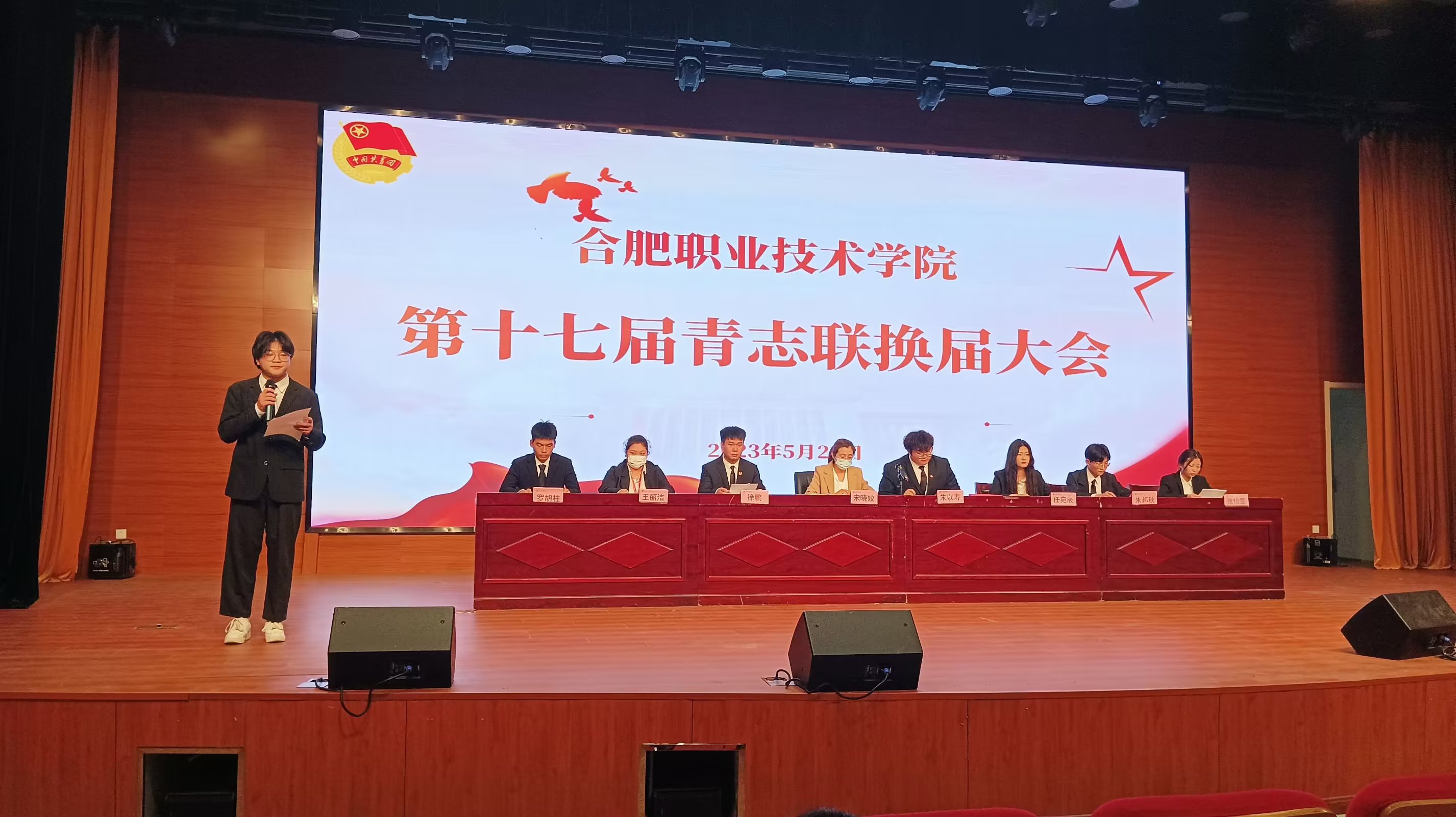 换届大会在国歌声中拉开序幕。青志联主席潘磊、朱以寿代表第十六届青志联向参会代表作工作报告,回顾了过去一年青志联在活动开展、组织建设等方面取得的成绩。接着,校团委老师宋晓姣、邵畏对过去一年的优秀志愿者进行了表彰,并宣读了新一届校青志联主席团及部门负责人名单。两位老师对当选的同学表示祝贺,之后阐述了青年志愿者联合会的内涵、重要性以及职责,并对新一届青志联、与会志愿者提出三点希望:一是坚定理想,矢志奋斗,在志愿服务中提升自我;二是不忘初心,学以致用,开展高质量志愿服务;三是牢记使命,主动担当,打造志愿服务品牌项目。随后进行了换届交接仪式,彭梦成、王子琪同学代表新一届青志联发言,他们表示将勇敢承担起学校和社会赋予的责任,做志愿服务精神的践行者和引领者,打造具有合职特色的青年志愿服务团队。最后,新一届青志联同学一起进行了志愿者宣誓。