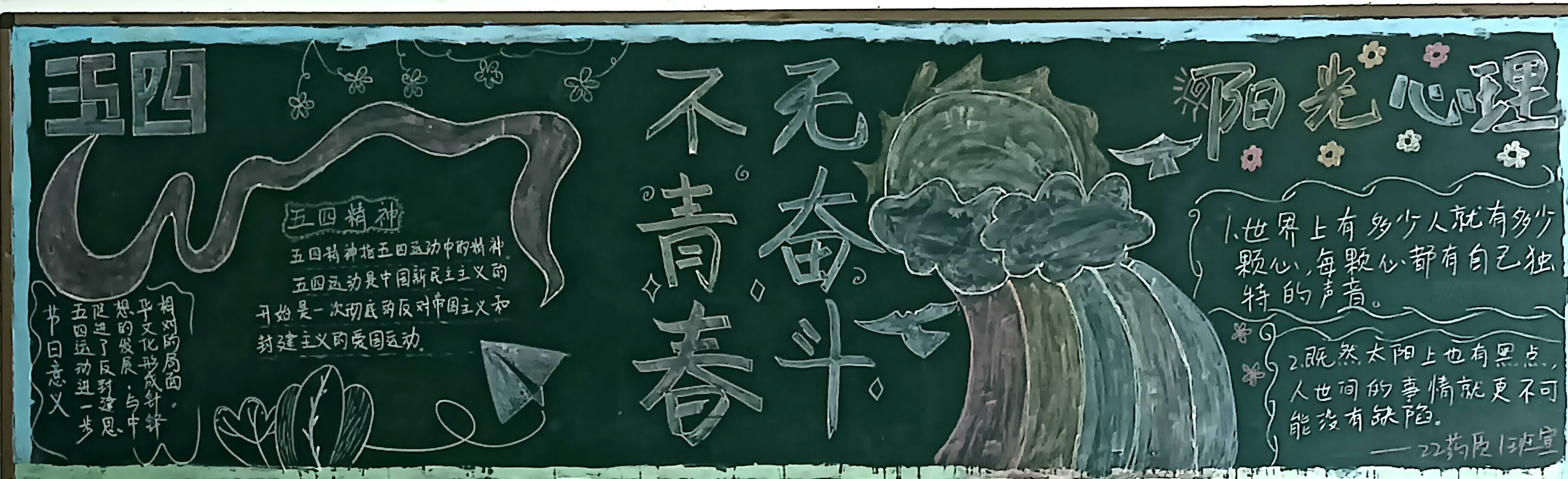 在学院的号召之下,同学们积极投入黑板报设计之中,将青年文化建设与五四青年节相结合,展现爱国情怀的同时,也用文字和图画表达出了自己对新时代的美好祝愿,一笔一划在黑板上勾勒出青春的光彩,时代的蓝图。用太阳代表蓬勃向上的态度,用鲜花代表美好自信的活力,用飘扬的红旗代表春的姿态,体现出当代青年人奋进坚韧,坚守初心的品质,传达爱国、进步、民主、科学的五四精神。