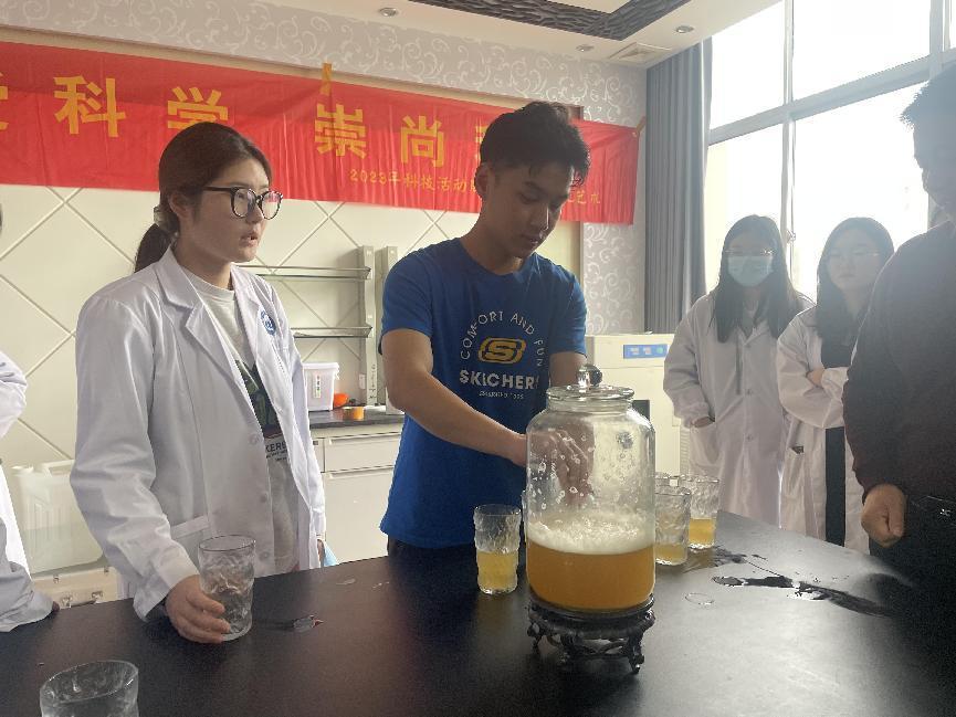 同时此时也正赶上实训项目内容——清香白啤和慕尼黑啤发酵结束,这是食品专业老师带领学生耗时两天制作出来的自酿啤酒,属于教研室每年的特色实训内容,经过一个多星期的低温发酵,老师们拿来了酒杯,邀请参加活动学生一一品尝,食品感官检测是一项非常重要的品鉴技能,根据人的感觉器官对食品的各种质量特征的“感觉”,如:味觉、嗅觉、听觉、视觉等;用语言、文字、符号或数据进行记录,再运用统计学的方法进行统计分析,从而得出结论,对食品的色、香、味、形、质地、口感等各项指标做出评价的方法。老师教导学生们采用“一看、二嗅、三尝、四品”的方法对两种啤酒做出合理的评价,教授学生科学方法评价啤酒乃至部分食品的感官评分,大大拓宽学生知识面,最后在一片片欢声笑语中完成啤酒的品尝学习。
