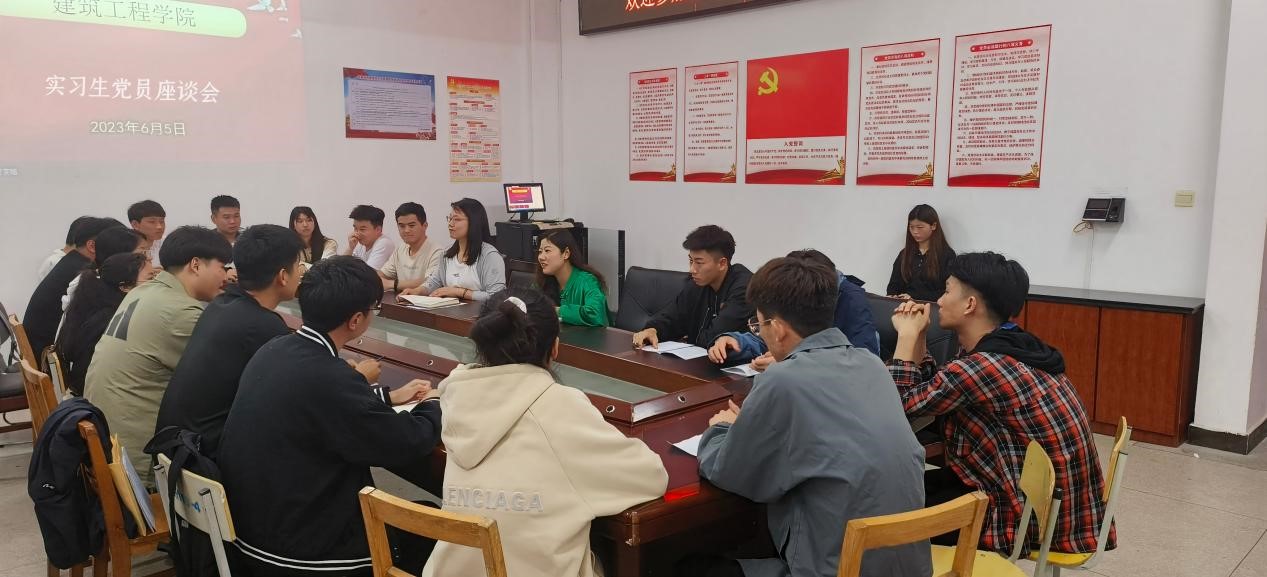 为加强学生党员在实习期间考察培养和教育管理,进一步提升学生党员的党性修养,坚定理想信念,6月5日下午,建筑工程学院学生党支部在支部党员活动室召开了实习生党员座谈会。该院党总支副书记施芳芳出席,36名21级实习生党员参加了座谈会。会议由该院专职组织员金琼琼主持。