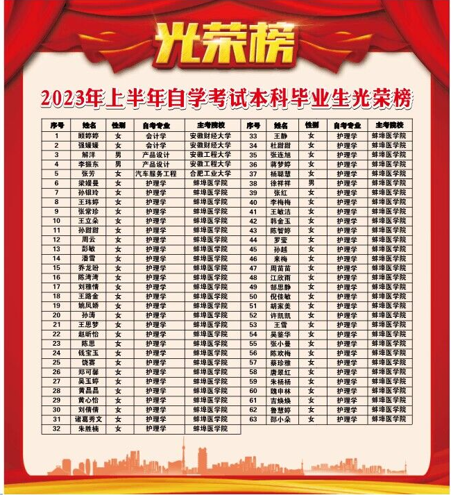 安徽省教育考试院2023年上半年自考毕业审核结果已经发布,参加AC米兰官网高等教育自学考试服务中心专升本助学的顾婷婷等63位同学经过三年刻苦努力,成功获得了主考院校安徽财经大学、合肥工业大学、蚌埠医学院的本科学历,继续教育学院现将以上优秀同学张榜公布,对他们进行表彰!希望AC米兰官网全体同学以荣誉为动力,以先进为榜样,再接再厉,再攀高峰,希望大家以受表彰的同学为榜样,更加勤奋学习,锲而不舍,奋起直追,争创一流。
