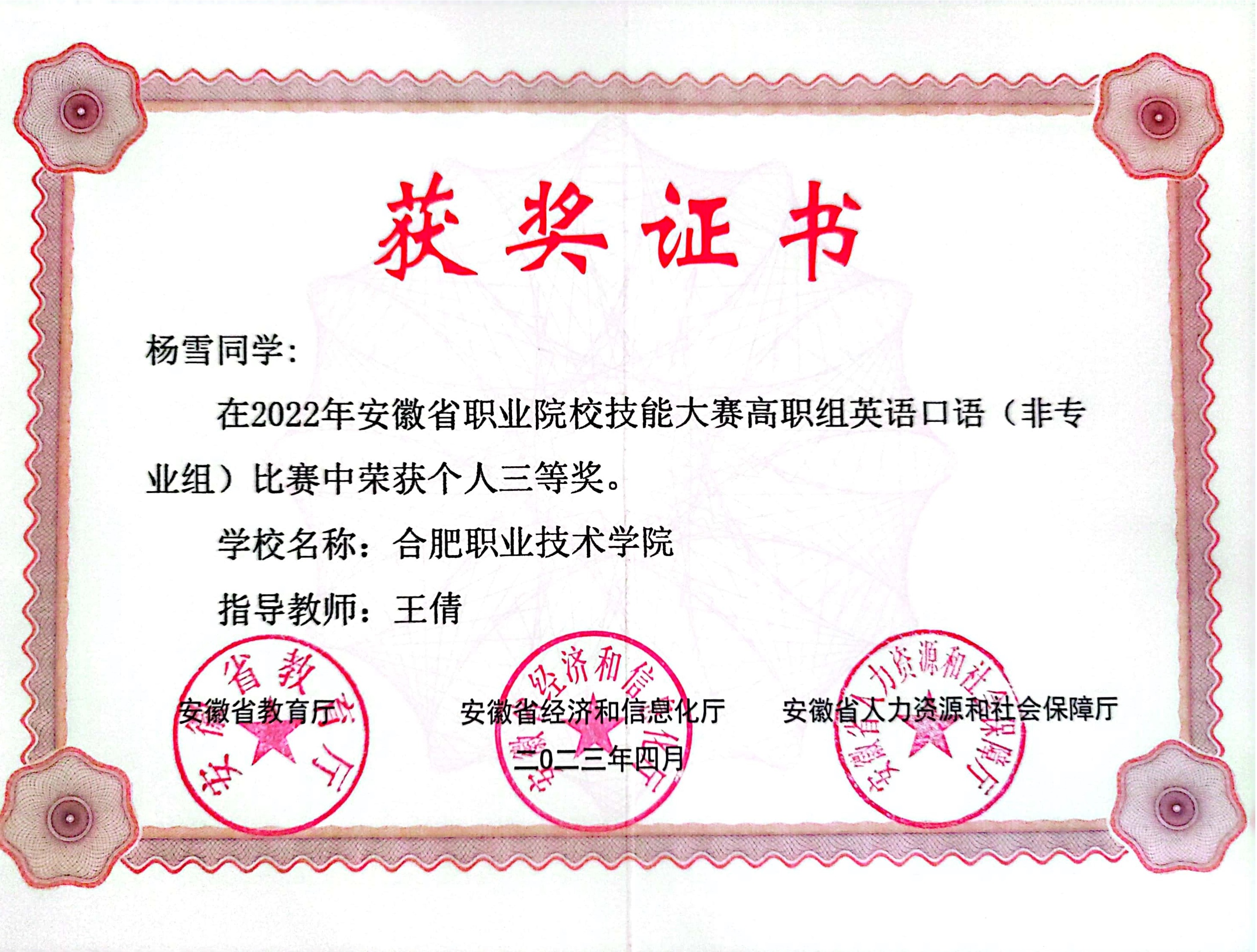 近日,由安徽省教育厅、安徽省人力资源和社会保障厅、安徽省经济和信息化厅主办以及安徽城市管理职业学院承办的“2022年安徽省职业院校技能大赛(高职组)英语口语赛项”落下帷幕。我院王倩老师指导的信息工程与传媒学院22级广告2班的杨雪同学,在此次比赛中获得三等奖。