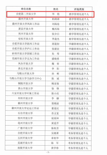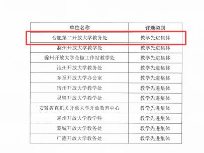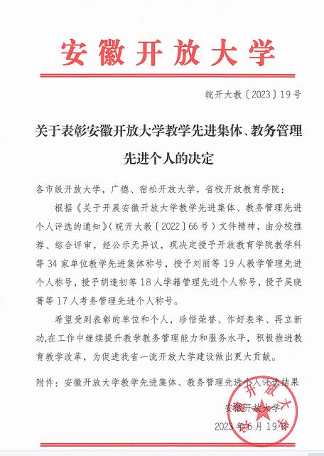 根据皖开大教【2023】19号文件《关于表彰安徽开放大学教学先进集体、教务管理先进个人的决定》,合肥第二开放大学教务处荣获“安徽开放大学教学先进集体”称号,华艳同志荣获“安徽开放大学教务管理先进个人”称号。