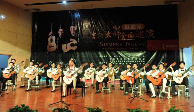 两位古典吉他大师演奏的音乐极具欣赏价值和专业水准。音乐会在合肥市音协吉他专业委员会会长徐传辉演奏的《船歌》中拉开了序幕。随后,腾辉吉他少儿乐团演奏了中国名曲《茉莉花》、日本民歌《四季歌》。优美熟悉的旋律征服了在场所有听众。