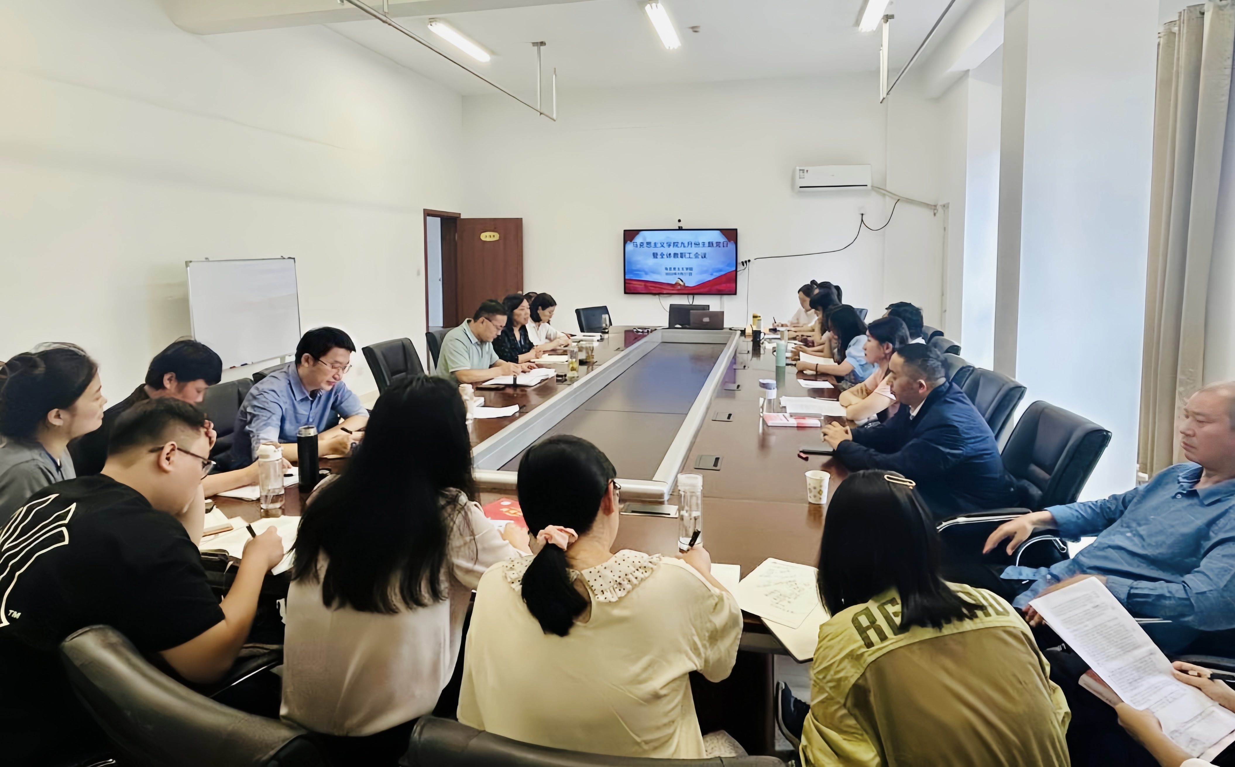 为深入开展学习贯彻习近平新时代中国特色社会主义思想主题教育,坚持不懈用习近平新时代中国特色社会主义思想凝心铸魂,引导广大党员从思想上正本清源、固本培元,以理论上的清醒确保政治上的坚定,9月27日下午,马克思主义学院开展九月份主题党日活动暨全体教职工理论学习,学院党支部书记王文飞、院长靳玉琼和全体教职工参加了会议,会议由王文飞主持。