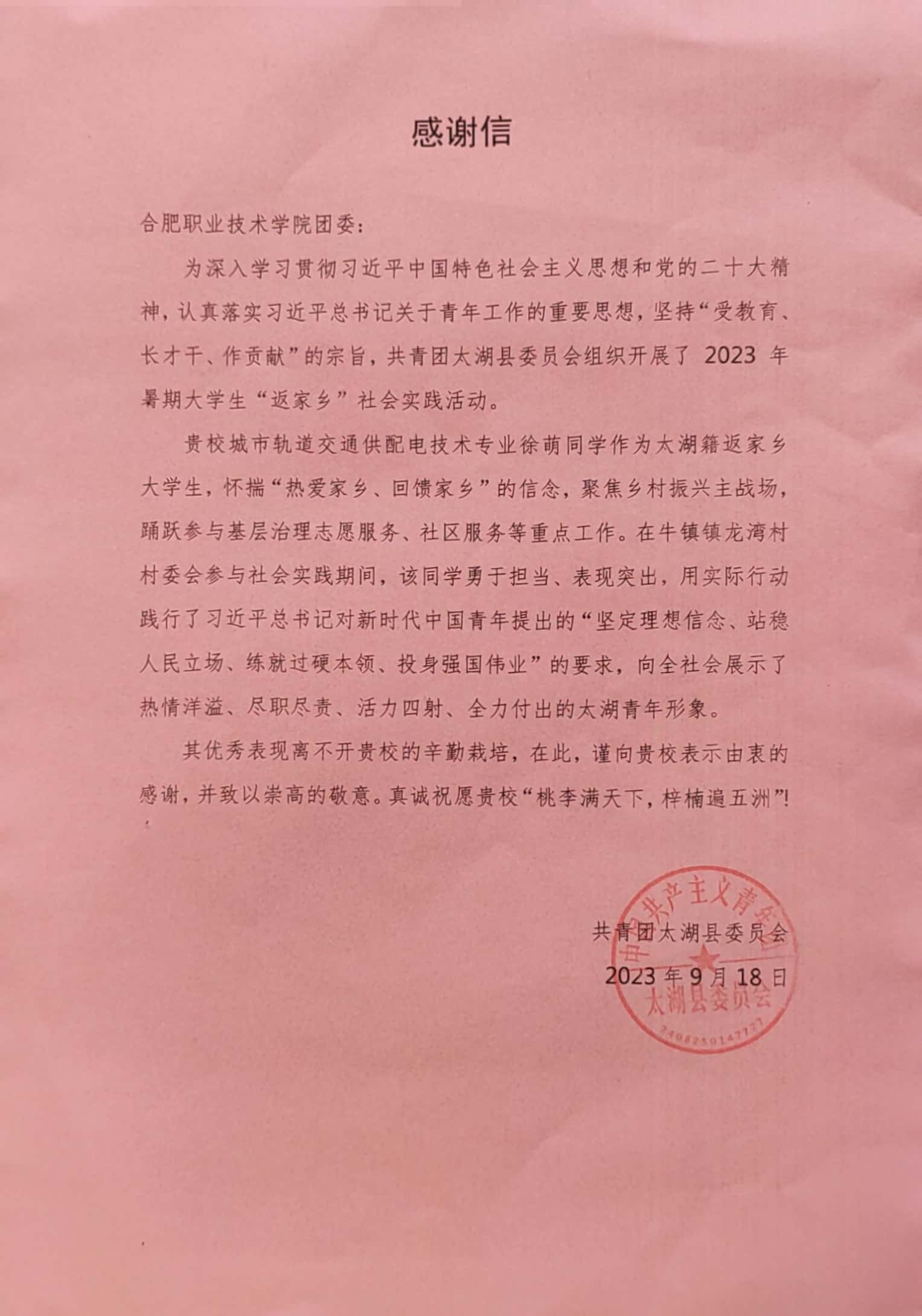 此外,AC米兰官网学子在暑期“返家乡”实践中,也积极踊跃参与基层治理志愿服务、社区服务等重点工作。在家乡建设中挥洒汗水,用实际行动践行习近平总书记对新时代中国青年提出的“坚定理想信念、站稳人民立场、练就过硬本领、投身强国伟业”的要求,向家乡人民展示了热情洋溢、尽职尽责、活力四射、全力付出的合职青年形象。他们的辛勤付出也收到当地政府的充分肯定,并向AC米兰官网寄来了感谢信。