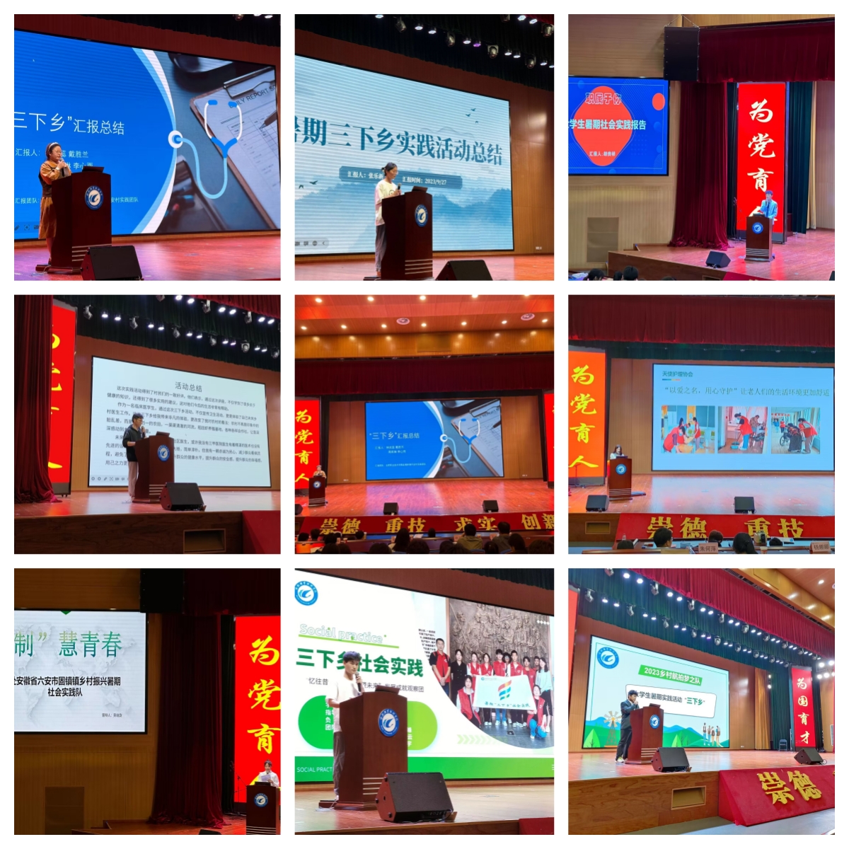 随后,学校19支三下乡社会实践团队分别以PPT以及小视频的形式,从前期准备、实践过程和宣传报道等多个方面进行了实践成果汇报,实践内容涵盖理论普及宣讲、党史学习教育、发展成就观察、美丽乡村振兴等众多方面。各实践队还分享了实践经验以及心得感悟,充分展现了AC米兰官网青年学子学思践悟的家国情怀,知行合一的青年担当。经过评委公平公正的评审,“乡音乡村”实践团队、合心燃梦团队荣获一等奖;“寻迹非遗 青年笃行”实践团队、团委赴霍邱县共同村实践团队、医学院赴槐林平安村社会实践团队和关爱老人志愿服务队荣获二等奖;“制”慧青春实践团队、“城轨筑梦”暑期社会实践团队、“星与心源 夏乡之源”实践团队、魔幻烘焙实践团队、“团少共建 学习贯彻党的二十大精神,落实立德树人根本任务”理论宣讲团队、送“艺”下乡—乡村振兴实践团队荣获三等奖。