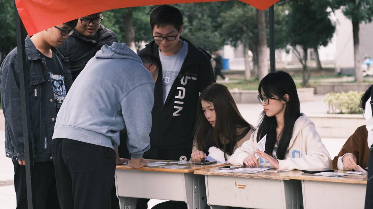 活动伊始,同学们来到签到处领取闯关卡,再前往不同打卡点挑战心理任务。“STROOP大作战”在一食堂广场前开展,“灰、蓝、紫……”来自不同班级的学生聚精会神地读着卡牌上的字的颜色,40秒的时间里,他们排除外界的干扰,在脑力激荡的过程中收获成就感,内心深层次的能量得到激发。