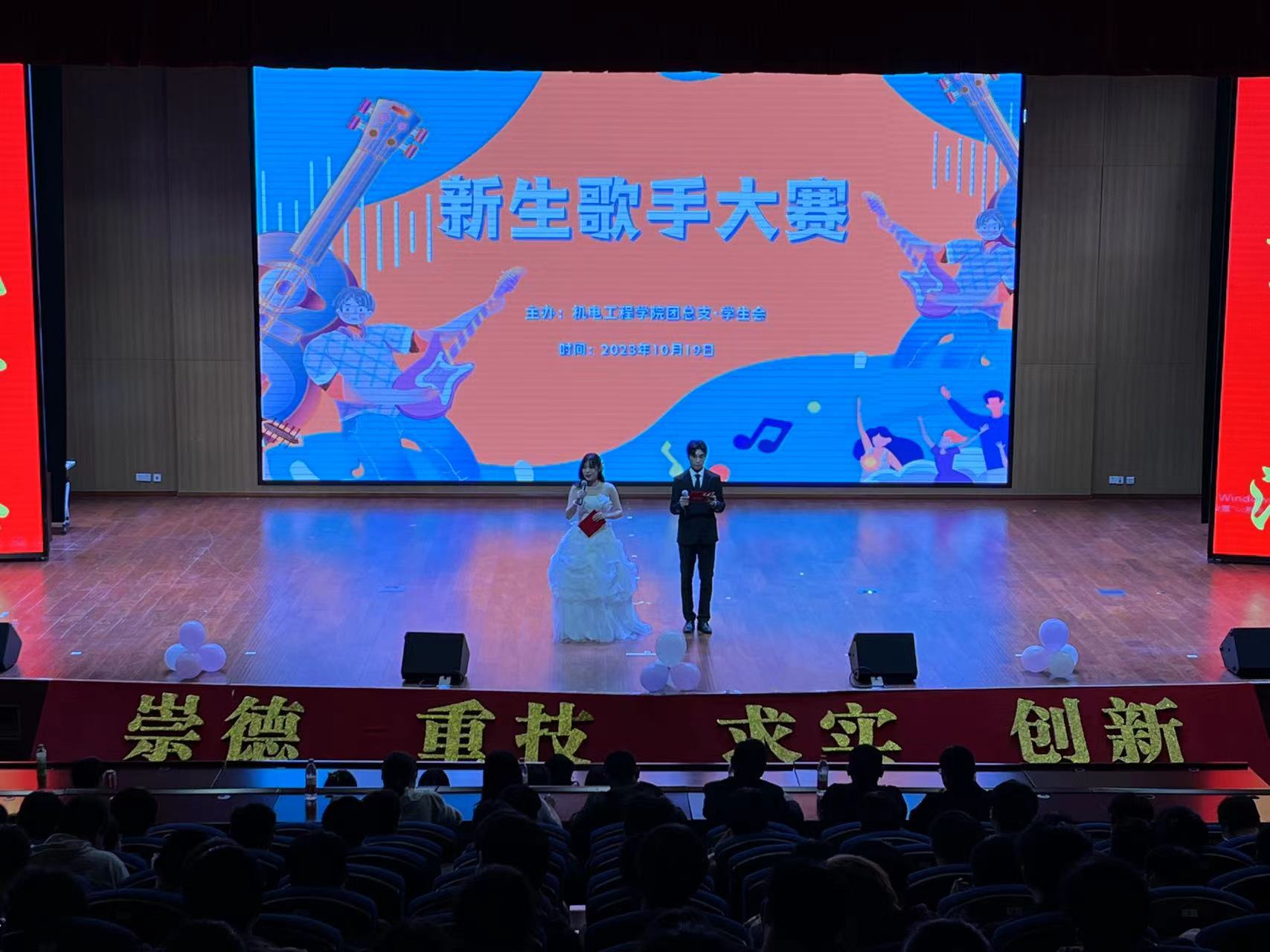 歌声嘹亮,音符飘扬。为展现新生的音乐才华,激发大学生参与校园活动的热情,营造积极向上的文化氛围。10月19日,由机电工程学院团总支主办的“新生歌手大赛”在大学生活动中心二楼顺利举办。机电工程学院党总支副书记(主持工作)丁迎春、党总支副书记宋忠春以及学院新生班级辅导员担任本次比赛评委,新生各班级代表参与活动。