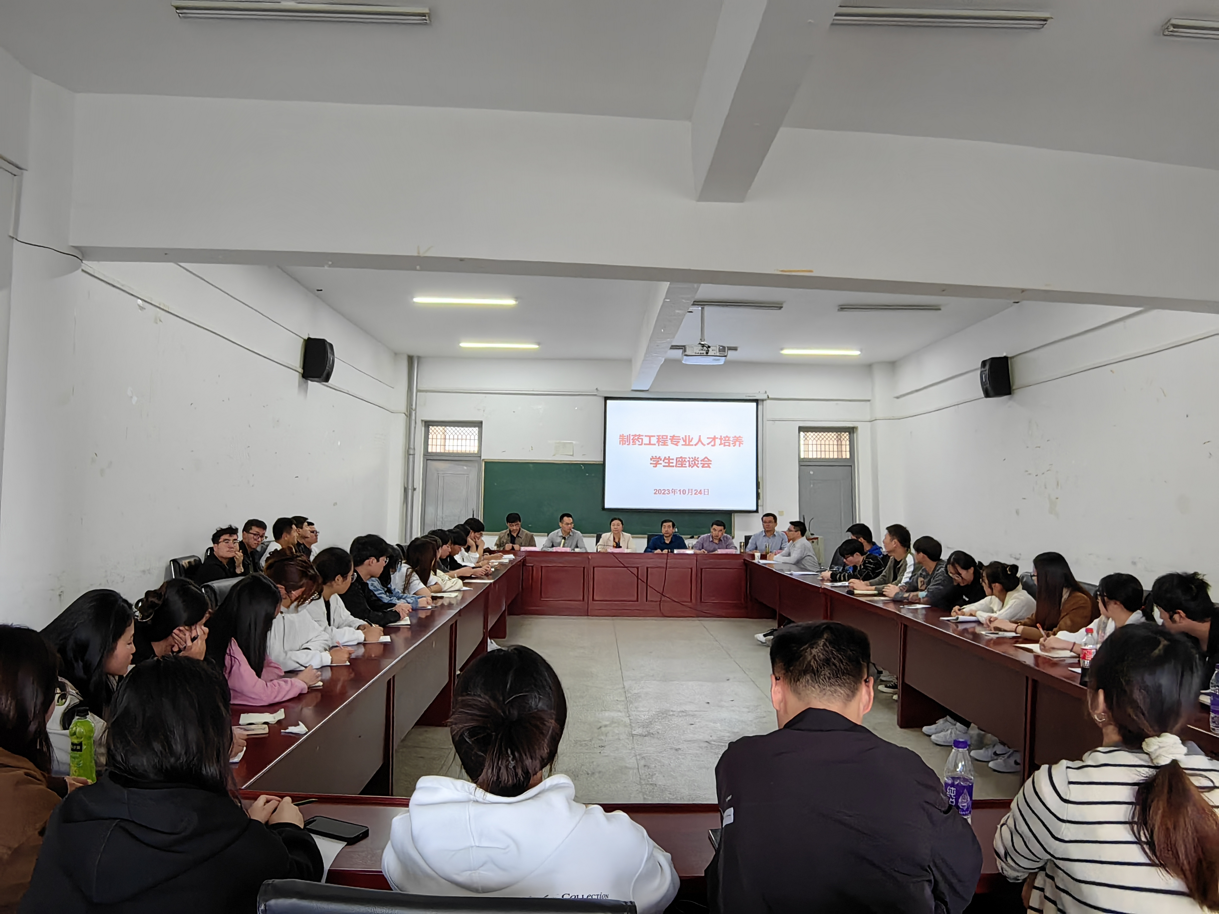 第二阶段是专业学生座谈会。慈龙保主持会议,22级制药工程专业全体学生参加了座谈会。学生们就一些关心的问题积极发言,包括党员发展、论文双选、实习、升学和就业等方面。