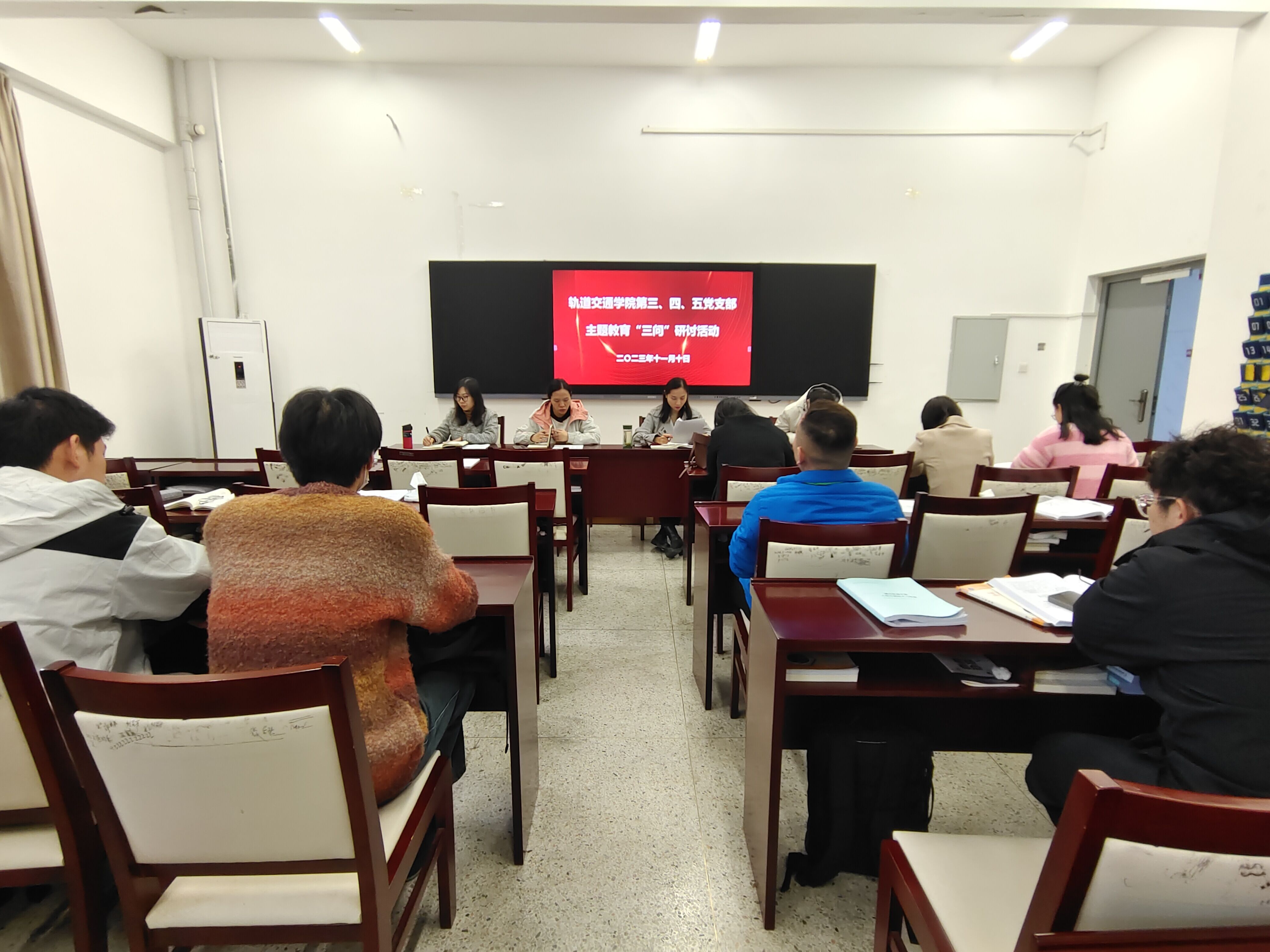 11月10日下午,轨道交通学院第三、四、五党支部开展了学习贯彻习近平新时代中国特色社会主义思想主题教育“三问”专题研讨活动,支部书记吴明丽、孙月及三个支部的全体党员参加活动,研讨活动由该院党总支副书记梁雯婷主持。