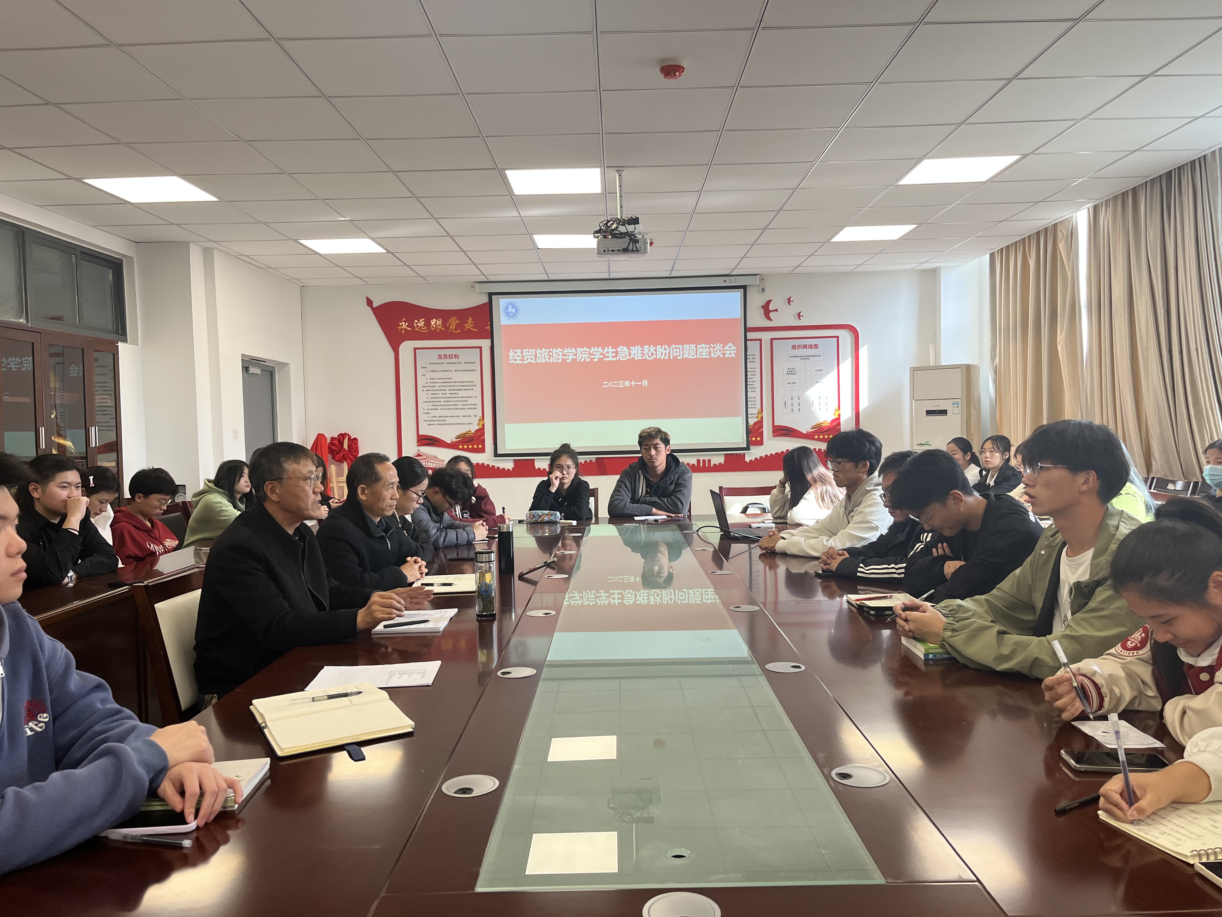 11月22日下午,经贸旅游学院在经贸楼三楼会议室召开在校学生“急难愁盼”问题座谈会。本次座谈会由该院团总支书记董如恺主持,学院党总支书记梅亚松、党总支副书记刘圣春、学管办全体教师以及学生代表应邀参加。