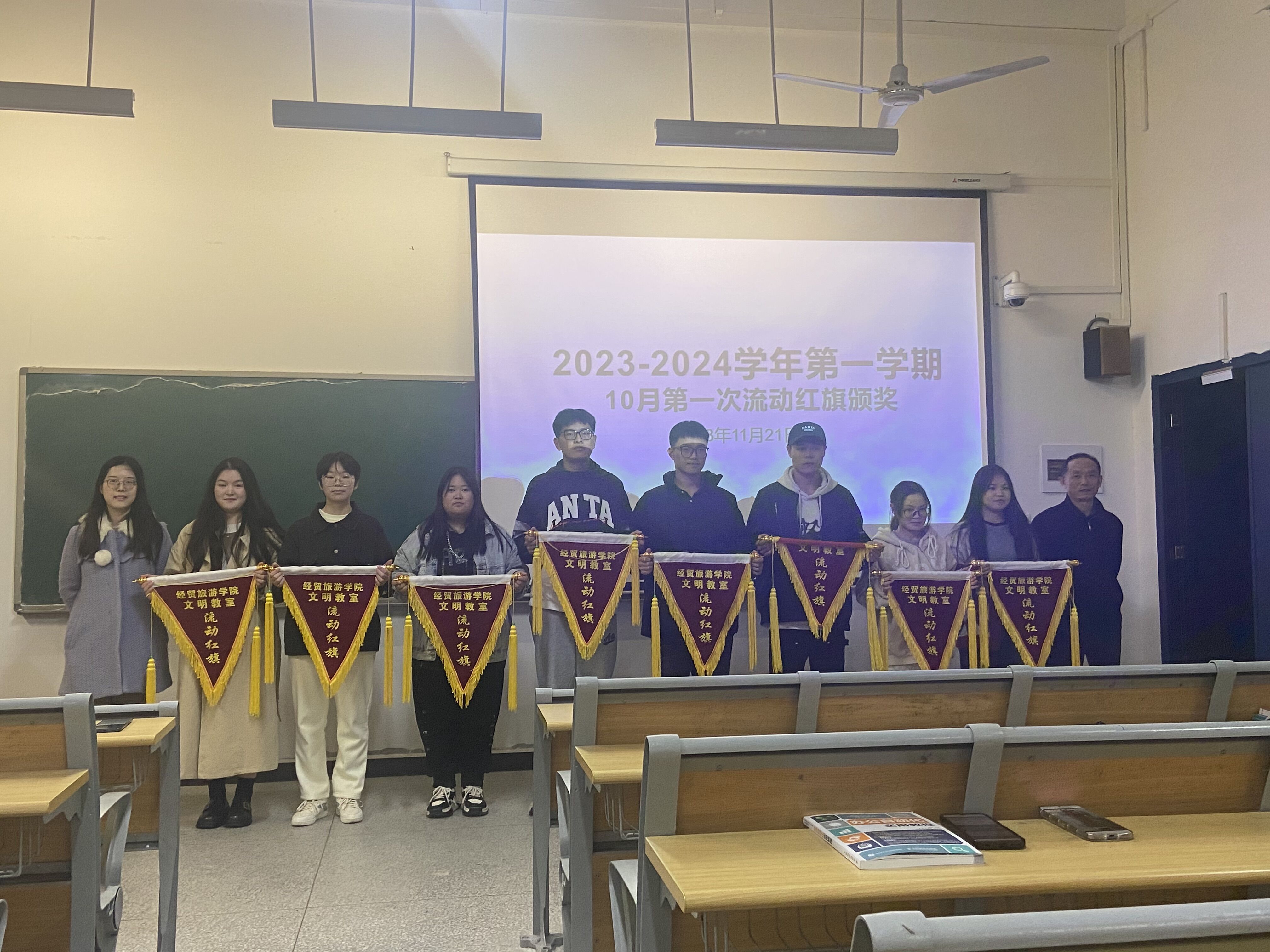 为规范班级卫生管理,优化学生日行为规范,促进学生良好习惯的养成,创造干净整洁舒适文明的学习环境,经贸旅游学院长期开展“文明教室流动红旗”评比活动。11月21日下午,学院在教学南楼111举行了新一届“文明教室流动红旗”颁奖仪式,23级班级劳动委员、自管委成员参加了仪式,仪式由张曦伦主持,学院党总支副书记刘圣春出席颁奖仪式并为获奖班级颁奖。